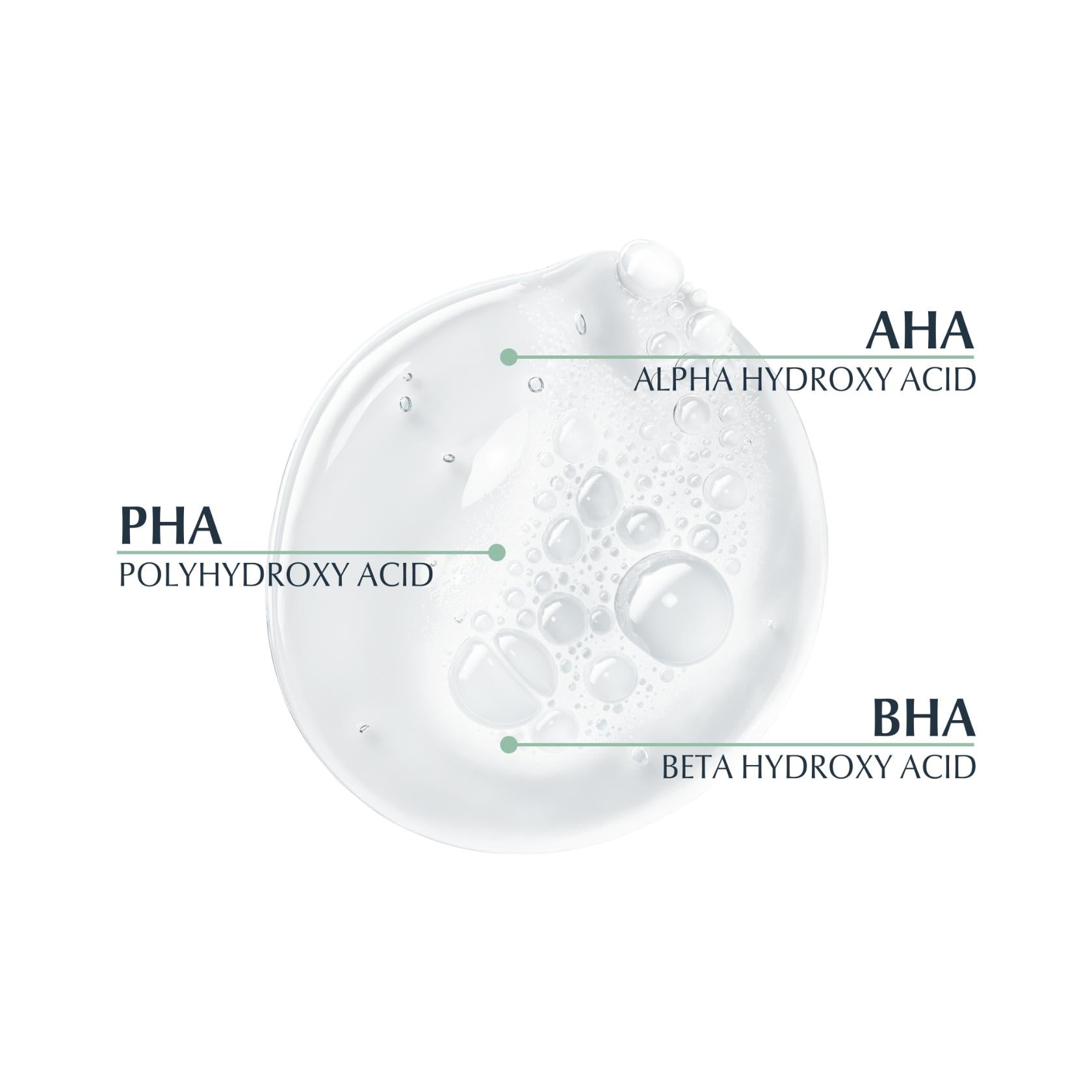 - O complexo AHA/BHA/PHA combina ácido glicólico, ácido salicílico e gluconolactona. Este complexo esfoliante remove as células mortas da pele para a deixar mais suave e luminosa, ajudando a reduzir as marcas pós-acne. Além disso, o ácido glicólico estimula a síntese de colagénio para ajudar a reduzir o aparecimento de rugas e rídulas, enquanto a gluconolactona hidrata a pele.