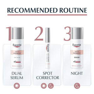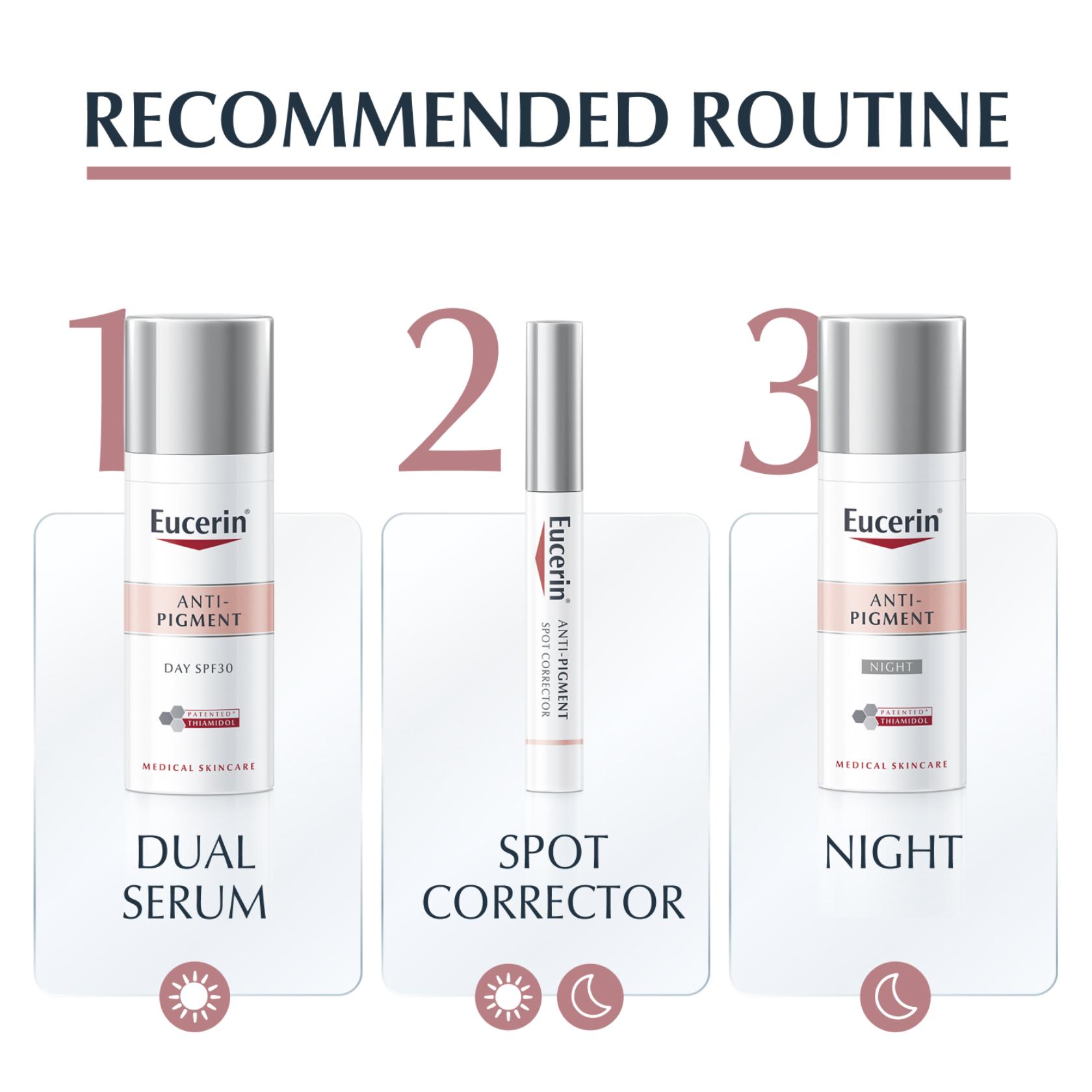 Aplique Eucerin Anti-Pigment Spot Corrector uma vez por dia à pele bem limpa. Aplique o produto com moderação e diretamente nas manchas escuras, tomando cuidado para evitar o contato com os olhos. Siga com o seu hidratante habitual. Para melhores resultados, use este produto em combinação com Eucerin Anti-Pigment Day Cream SPF30 e Eucerin Anti-Pigment Dual Serum . Aplique cada produto apenas uma vez por dia e não use mais do que quatro produtos contendo tiamidol por dia.