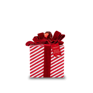 Ideal para a decoração de natal. Estrutura em poliestireno e é embrulhado com material soft touch de listras. Cada presente é adornado com uma fita de veludo vermelho e coberto com um sino vermelho metálico