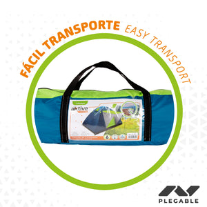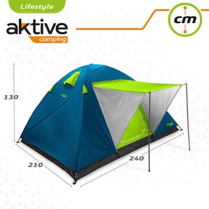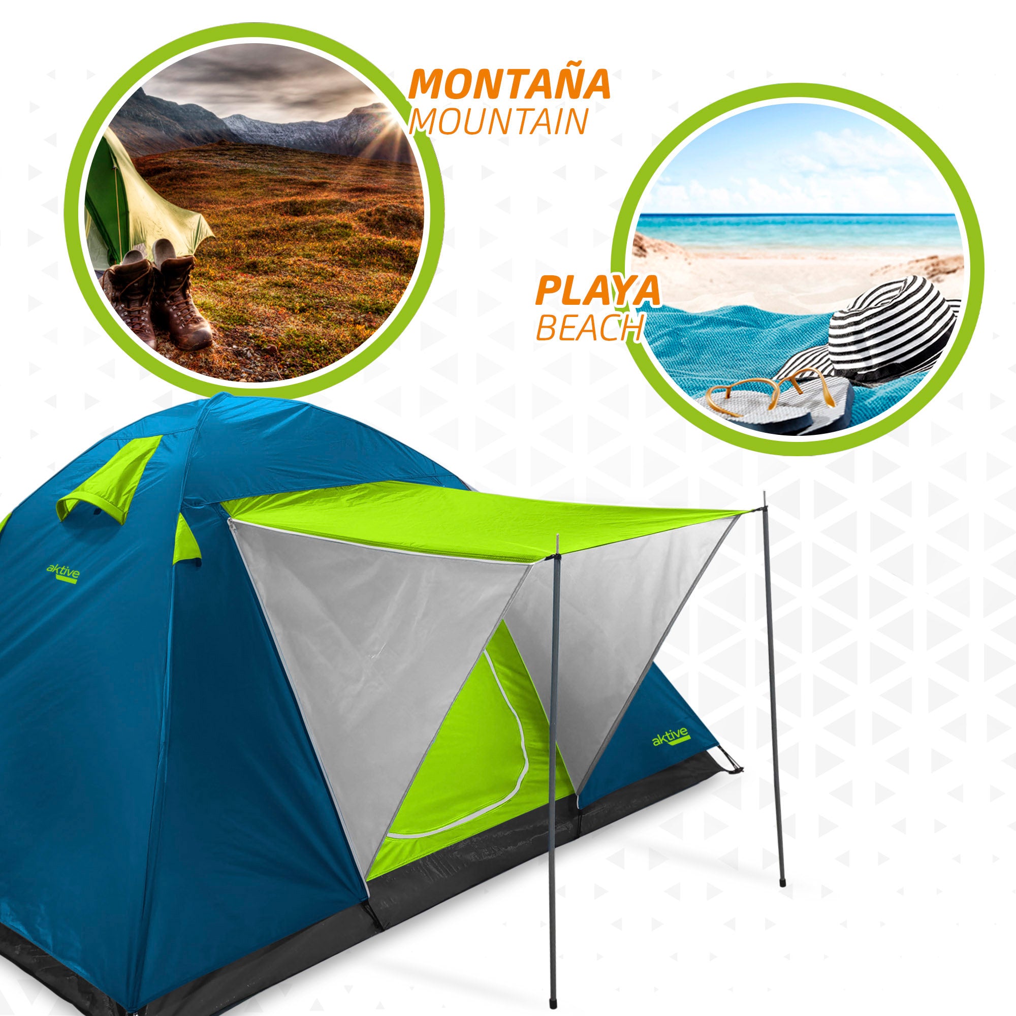 Equipa-te para as tuas escapadelas ao ar livre com esta tenda tipo iglu da linha Aktive Camping. Com medidas montadas de 240 cm de largura, 210 cm de comprimento e 130 cm de altura, é ideal para acampar 4 pessoas (a embalagem pode conter informações desactualizadas relativamente à capacidade das pessoas indicadas na descrição do artigo na Internet). Cor azul, cinza, verde fósforo e preto. Seu tecido é poliéster impermeável e as hastes de sua estrutura são feitas de fibra de vidro de 7,9 mm de diâmetro. Possui teto duplo com painéis de ventilação para proteger da chuva, porta dupla com zíper e mosquiteiro que também favorece a ventilação e protege contra insetos. Além disso, possui um toldo frontal embutido e inclui uma bolsa com alças para armazená-lo desmontado (61 x 17 x 15 cm) e transportá-lo facilmente (peso leve de 3 kg).