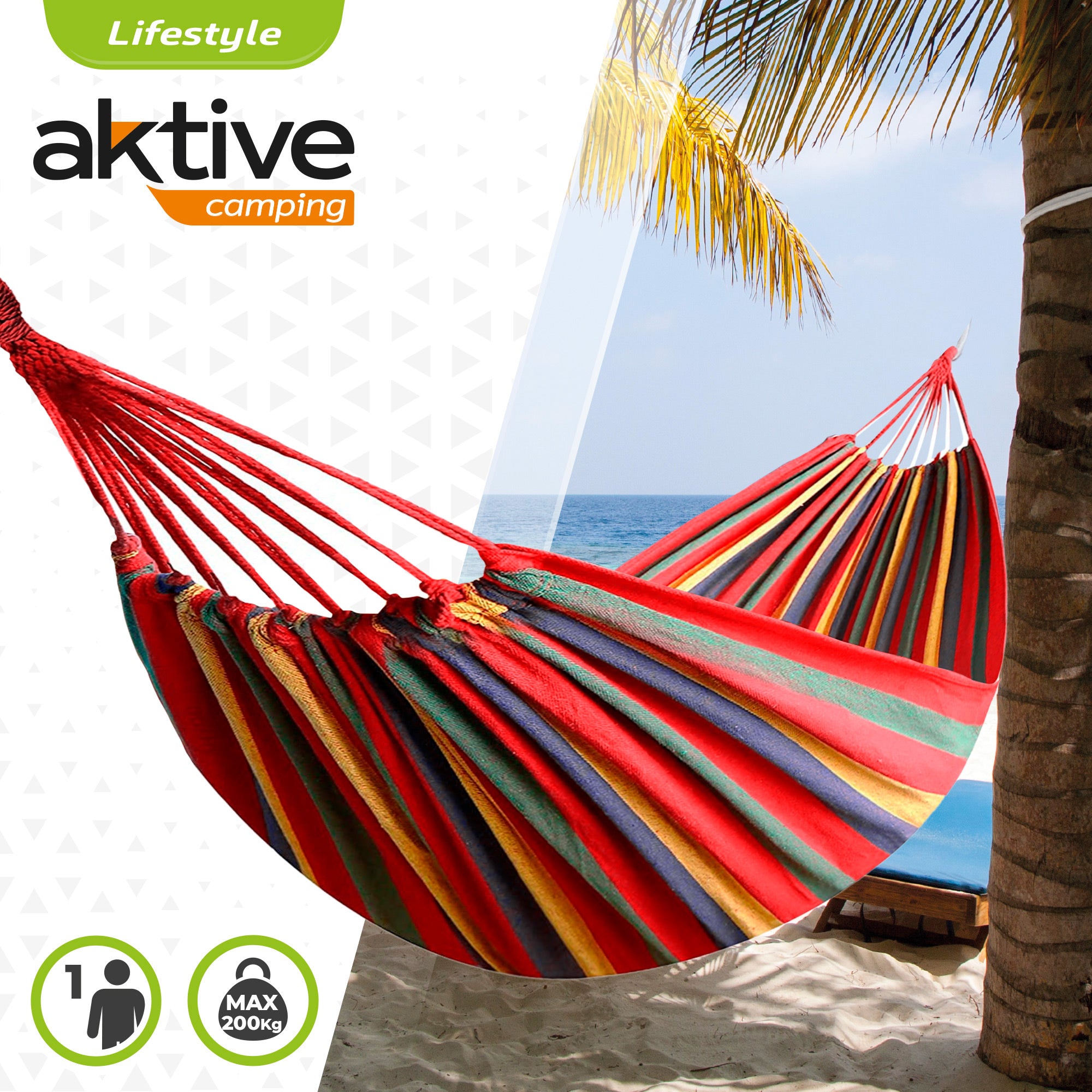 Rede de descanso em algodão Aktive Camping. A rede é confeccionada em algodão de alta qualidade nas cores vermelho, lilás, verde e amarelo, mede 200x100 cm, suporta um peso máximo de 200 kg e pode acomodar 1 pessoa. Inclui 1 corda branca com 2 metros de comprimento para amarrar a uma parede ou árvores. Inclui bolsa de transporte para transporte.