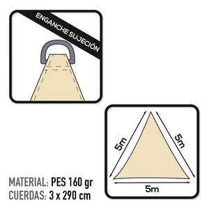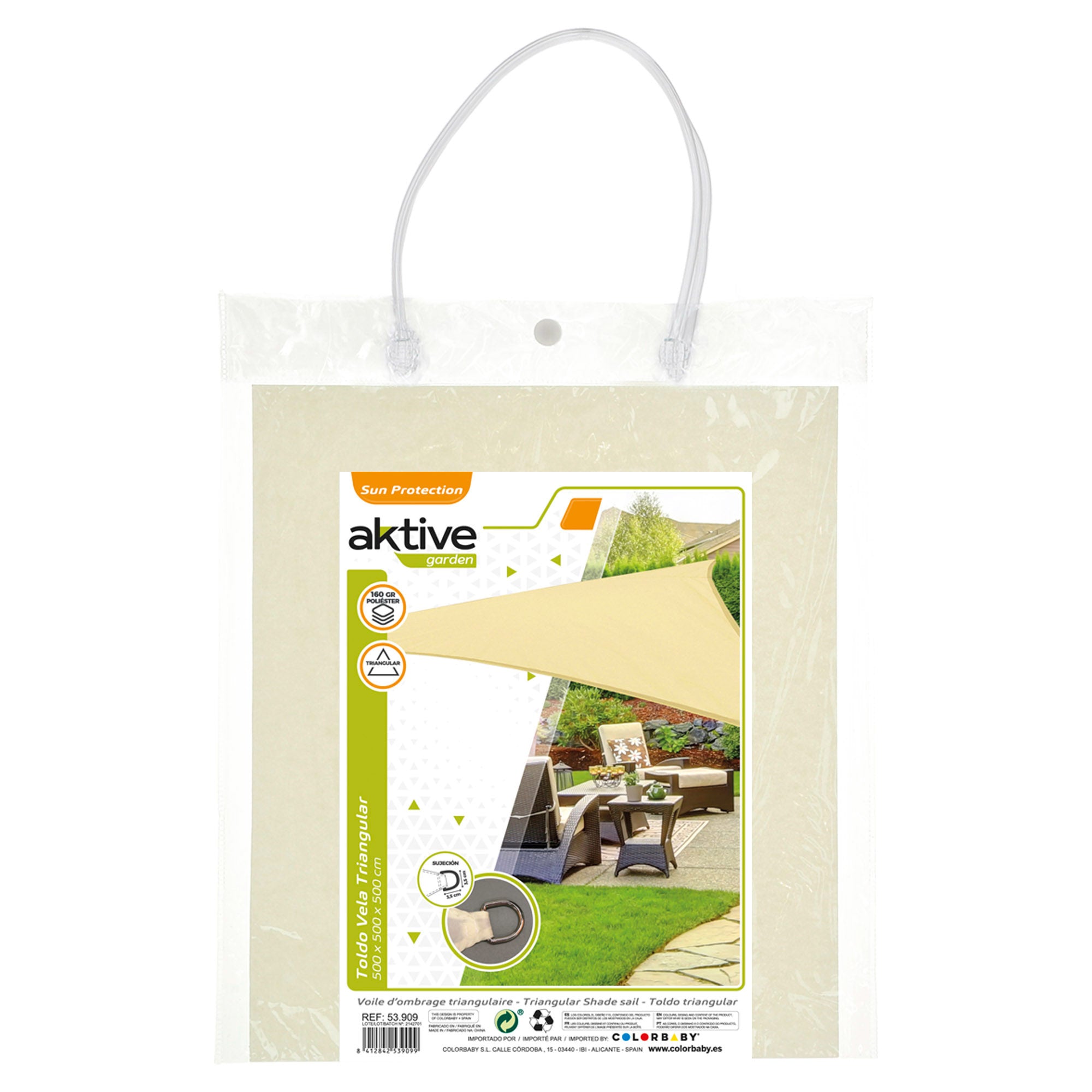 Cubra o seu jardim ou terraço com uma solução rápida e barata: a vela de sombra Aktive Garden. Fabricado em material 100% poliéster de 160gr / m2 resistente às intempéries. Os cantos são totalmente reforçados e com argolas para facilitar a fixação com os 3 cabos incluídos com 290 cm. De formato triangular e cor creme, o toldo mede 500x500x500 cm. Decore o seu exterior com Aktive.