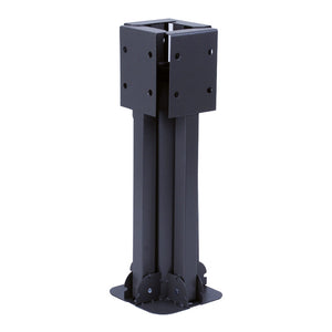 Com orifícios em cada pé, que permitem aparafusar a base ao solo, podendo ser igualmente utilizadas placas de cimento