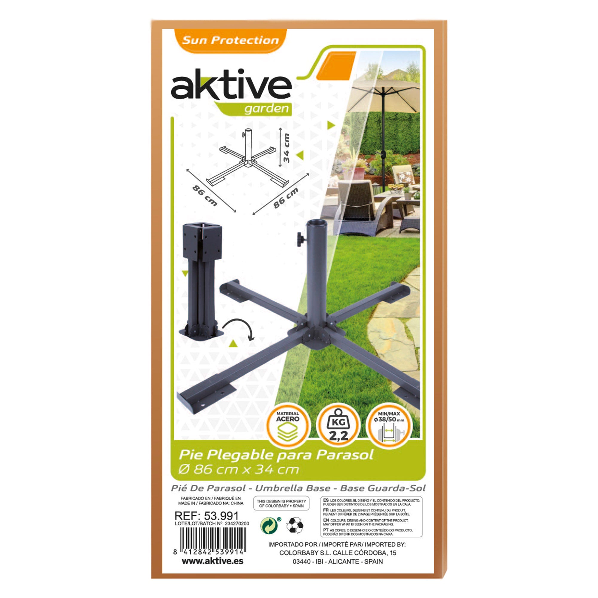 Base cruzada do guarda-sol Aktive Garden, o acessório ideal para guarda-sóis e guarda-sóis de jardim, terraço ou pátio. O suporte é feito de aço, o tubo possui uma rosca ajustável que permite segurar mastros de 35 a 38 mm de espessura. Suas 4 pernas são dobráveis e podem ser aparafusadas ao solo. Pode ser usado sozinho ou com ladrilho de cimento no topo. Habilitado para uso externo.