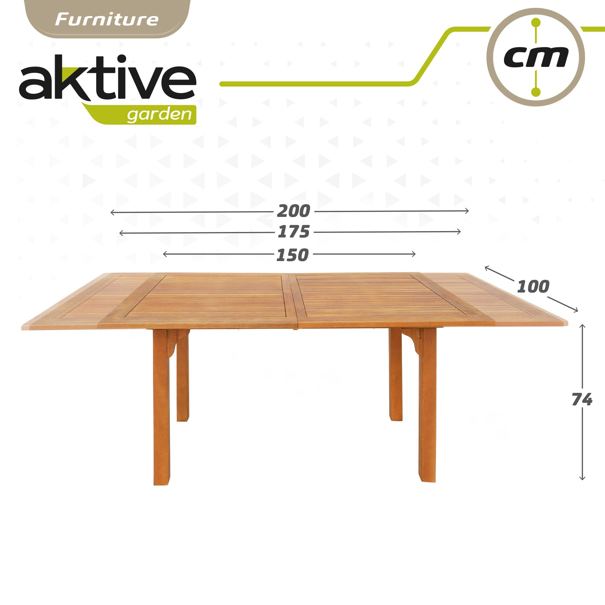 Mesa de jardim extensível em formato retangular da Aktive Garden. Tem um design elegante e contemporâneo na cor natural da madeira e é 100% madeira de acácia com acabamento a óleo, ideal para exteriores e resistente à chuva e à exposição solar. As suas medidas são 150/175/200 cm de largura, 100 cm de comprimento e 74 cm de altura, pelo que tem capacidade para 6 a 8 pessoas. O centro da mesa está habilitado para colocar um poste de guarda-chuva ou guarda-sol (não incluído).