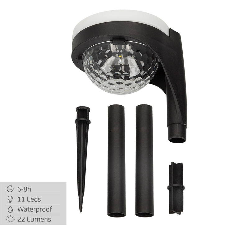 Pack de 2 focos solares Aktive Tech para iluminar o jardim, pátio ou qualquer outra área exterior de forma eficiente e sustentável, uma vez que possui um painel solar na parte superior que se recarrega com a luz do sol. Os focos são de luz dupla e possuem 11 LEDs que geram uma luz com intensidade de 22 lúmens. Além disso, pode funcionar continuamente por 6 a 8 horas após a carga, tornando-o ideal para uso noturno e em situações de pouca luz. Possui um botão que permite ligá-lo ou desligá-lo para prolongar a vida útil da bateria quando o foco não estiver em uso e sua construção à prova d'água IP44 o torna adequado para uso em condições climáticas adversas.