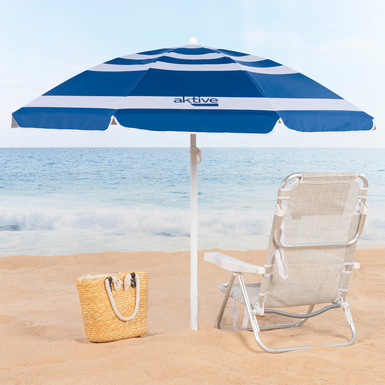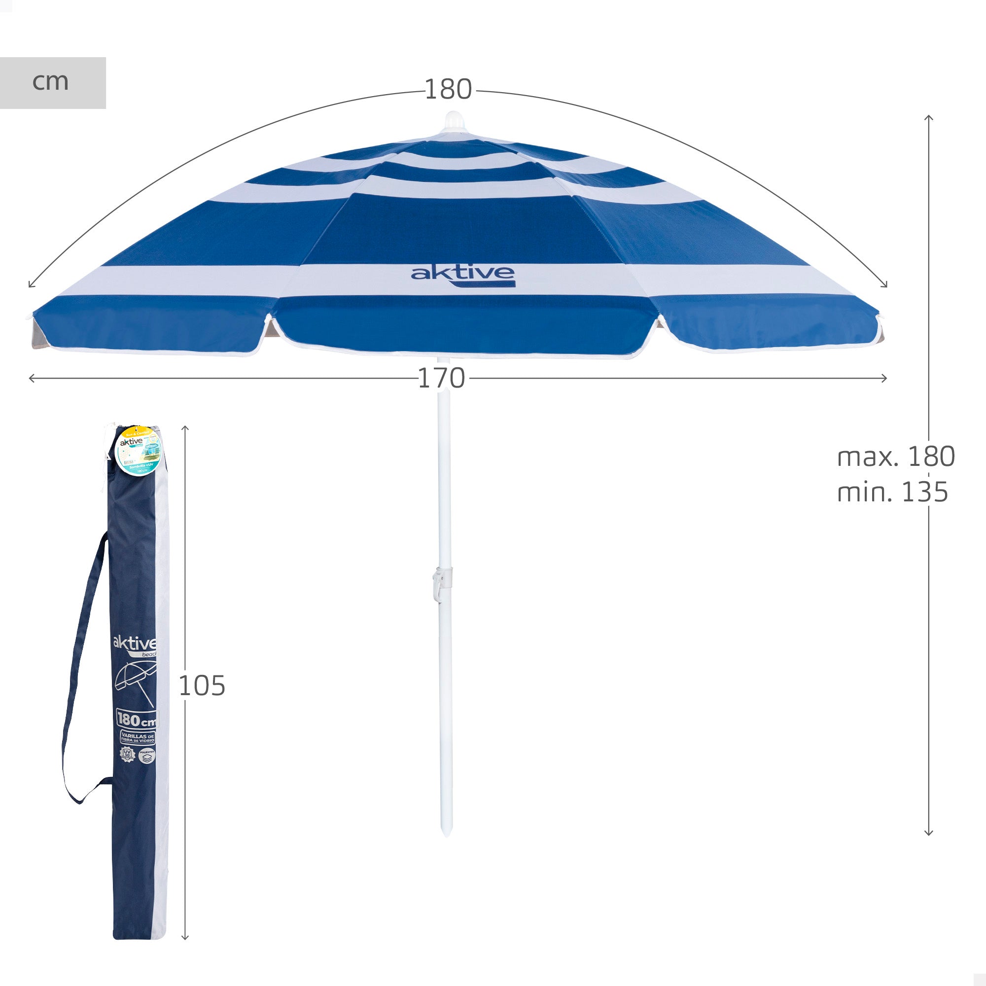 Guarda-sol de alta qualidade Aktive Beach. O guarda-chuva é de forma octogonal e tem um design estilo marinheiro listrado de azul e branco com uma haste branca. Sua proa tem 180 cm e seu mastro regulável em altura tem 28/32 mm de diâmetro. O guarda-sol é confeccionado em tecido de poliéster, possui revestimento prateado com proteção UV50 e sua haste é de alumínio. Uma das características que o tornam especial são as suas 8 hastes flexíveis em fibra de vidro. Além disso, seu mastro de alta resistência é inclinável, de modo que o guarda-chuva pode ser orientado de acordo com a posição do sol. Inclui armazenamento correspondente e bolsa de transporte com alça de ombro.