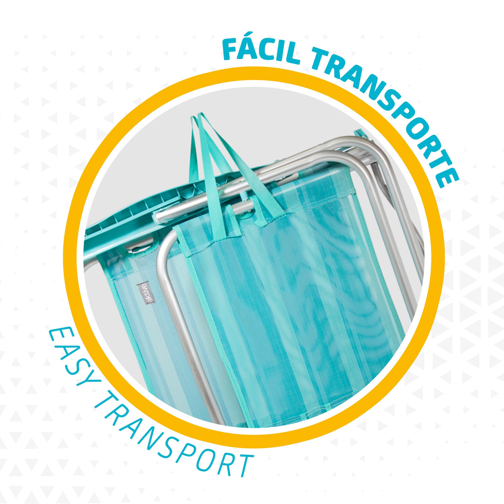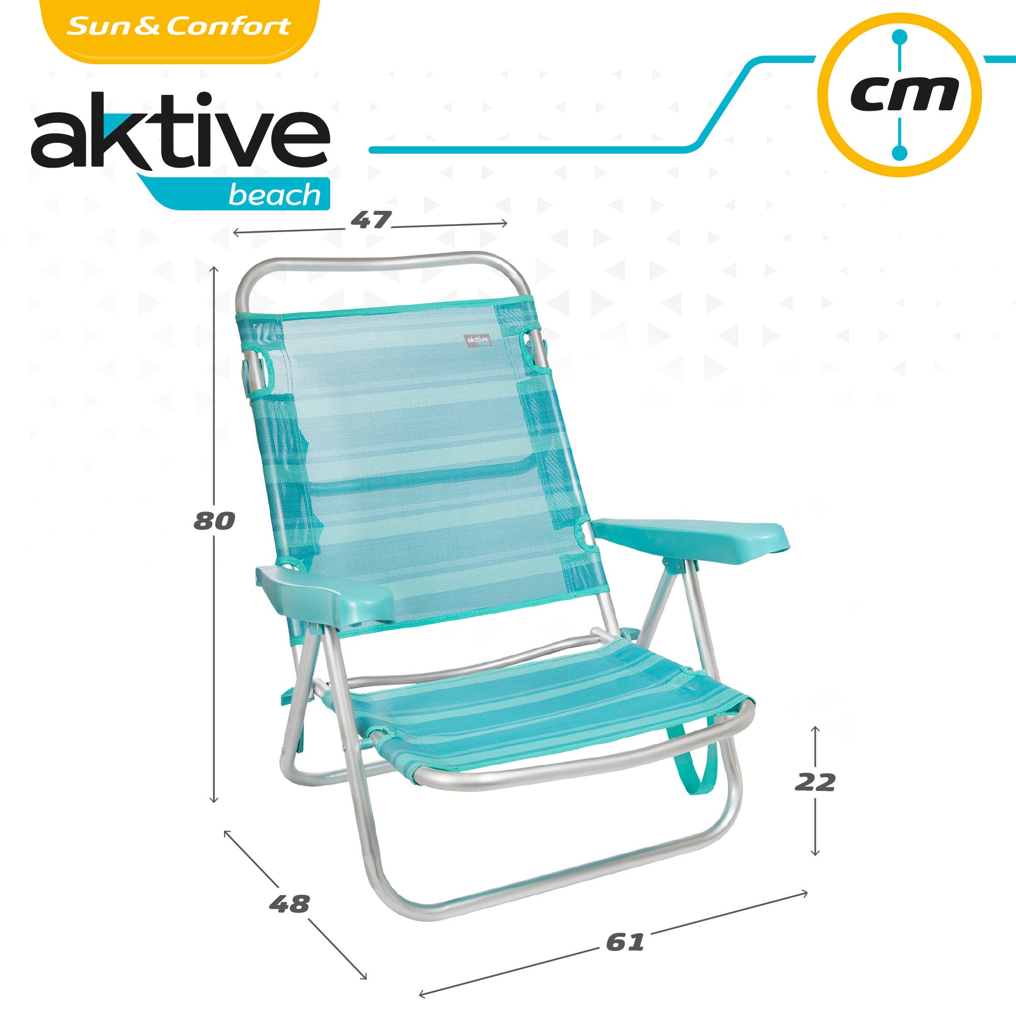 Pack de poupança composto por duas cadeiras de praia dobráveis multiposições, modelo Mediterráneo Aktive Beach, cor turquesa. Mede 47 x 48 x 80 cm aberto, 68 x 61 cm dobrado, seu assento tem uma altura de 22 cm acima do solo e a distância entre os braços é de 61 cm. É feito de tecido textileno e sua estrutura de alumínio com tubos de 22 cm de diâmetro suporta um peso máximo de 100 kg. Seu encosto pode ser colocado em até 5 posições diferentes que são ajustadas usando os apoios de braços, permitindo que ele seja convertido em uma espreguiçadeira graças ao suporte de alumínio localizado na parte traseira. A cadeira se dobra em segundos em uma peça compacta e pode ser transportada de maneira fácil e confortável, como uma maleta, graças às alças embutidas.