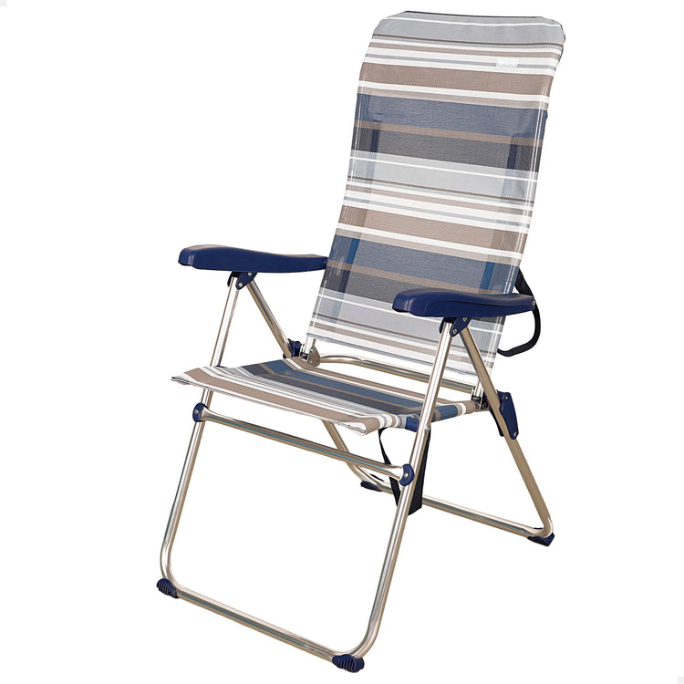 Cadeira de praia Aktive Beach de 5 posições. Mede 47x66x108 cm (assento 42 cm de altura e distância entre braços 61 cm de largura), feito de alumínio com tubos de 2 cm de espessura. Dobrável leve e compacto com apoios de braços em PVC e almofadas antiderrapantes nas pernas. Inclui alça para transportá-lo confortavelmente. A cadeira dobrada mede 104x61 cm. O assento é confeccionado em textilene, um tecido confortável, flexível e de secagem rápida com desenho listrado em azul e cinza.