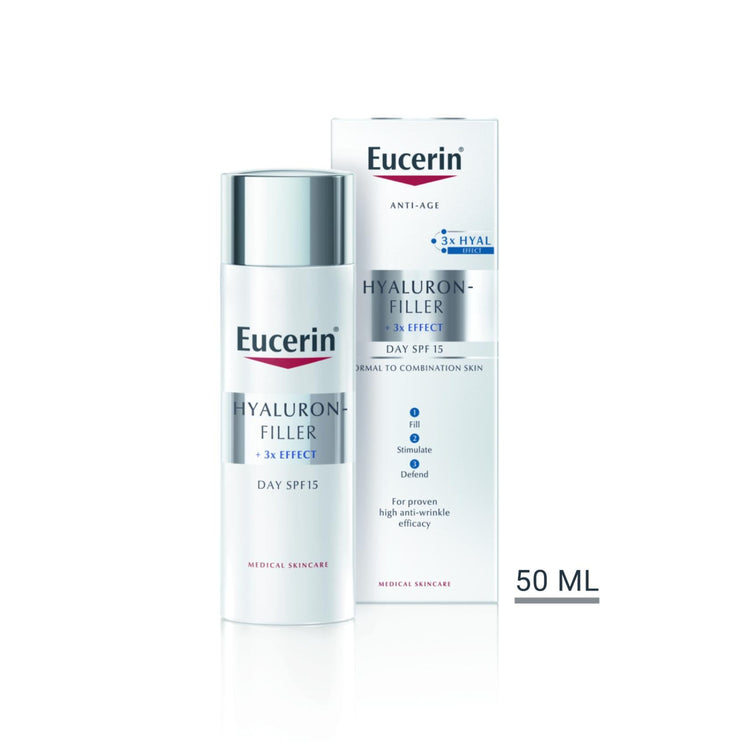 Eucerin Hyaluron-Filler 3x Effect Day Cream Normal Skin SPF15 é um creme diário especialmente formulado para neutralizar os primeiros sinais de envelhecimento em peles normais a mistas. Com uma fórmula única, não só hidrata a pele e minimiza o aparecimento de linhas finas e rugas, mas também embeleza as já existentes, conferindo à tez um aspecto mais suave e jovem. Com fórmula de triplo efeito, é capaz de preencher, estimular e defender a pele. O ácido hialurônico melhora a hidratação e tonifica a pele. A glicina saponina estimula a produção de ácido hialurônico e protege a pele dos radicais livres. E a Enoxolona protege o ácido hialurônico da própria pele da degradação. Além disso, a presença de filtros solares também permite que este creme proteja a pele dos raios UVA e UVB.