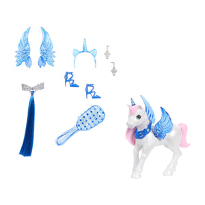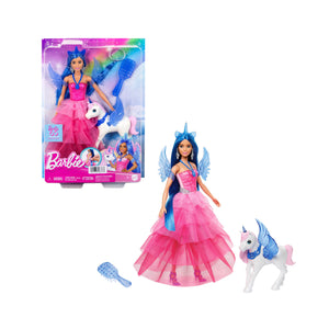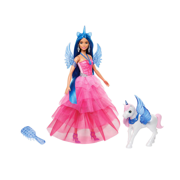 As crianças podem celebrar o 65. aniversário da Barbie com uma boneca encantadora! Inspirado pela sua personagem na Barbie A Touch of Magic, este deslumbrante alicórnio (unicórnio alado) usa um vestido de rosa em degradê. O cabelo azul está coberto com uma bandolete de unicórnio, enquanto as asas e a cauda removível adicionam um toque extra de estilo de fantasia. A boneca inclui brincos prateados, saltos com fivela, uma escova e um amigo alicórnio mágico! A boneca não fica de pé sozinha.
