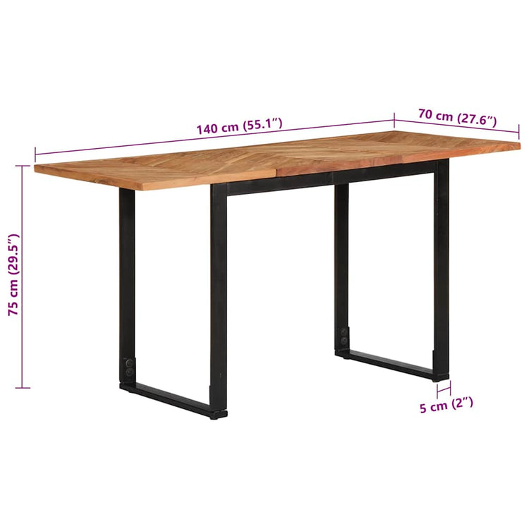 Desfrute todos os dias de uma refeição perfeita com a sua família ou amigos, nesta mesa de jantar em madeira! Material robusto e estável: a madeira de acácia maciça é conhecida pela sua resistência e durabilidade. As suas cores diversas e os padrões do grão únicos conferem-lhe uma aparência atraente. Com boa estabilidade e resistência às intempéries, é ideal para a confeção de mobiliário de interior e exterior.Estrutura robusta: A estrutura de ferro da mesa da cozinha adiciona um estilo industrial ao seu interior, garantindo robustez, estabilidade e longevidade.Tampo prático: o tampo robusto da mesa de jantar é perfeito para colocar refeições, bebidas e outros artigos decorativos.Com pernas: As pernas elevadas facilitam a limpeza debaixo da mesa de jantar, mantendo uma aparência arrumada e garantindo um melhor fluxo de ar em torno dos equipamentos eletrónicos. Dica útil:A cor e os grãos variam de peça para peça, tornando cada uma única. A entrega é aleatória, assegurando a exclusividade e a individualidade do seu produto.nan