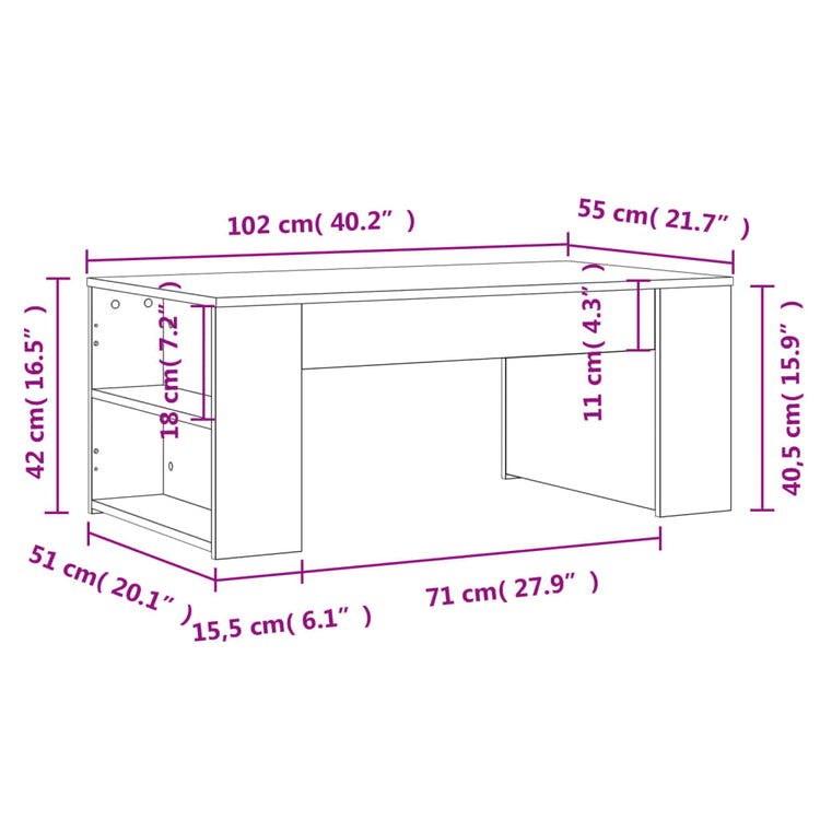 Dê um toque de elegância à sua sala de estar com esta moderna mesa de centro. Material durável: os derivados de madeira possuem uma qualidade excecional e oferecem uma superfície suave bem como força, estabilidade e resistência à humidade.Amplo espaço de arrumação: a mesa de apoio oferece um amplo espaço de arrumação para manter os seus artigos essenciais bem organizados e ao seu alcance.Tampo robusto: o tampo robusto da mesa de apoio ao sofá é perfeito para colocar bebidas, alimentos e outros artigos decorativos.nan
