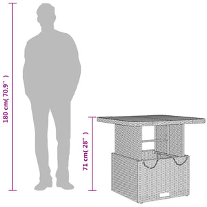 - Tampo de mesa ajustável: o tampo da mesa pode ser levantado para a tornar mais alta, o que permite transformar a mesa de centro numa mesa de jantar. É perfeita para receber convidados ou fazer as refeições no exterior.