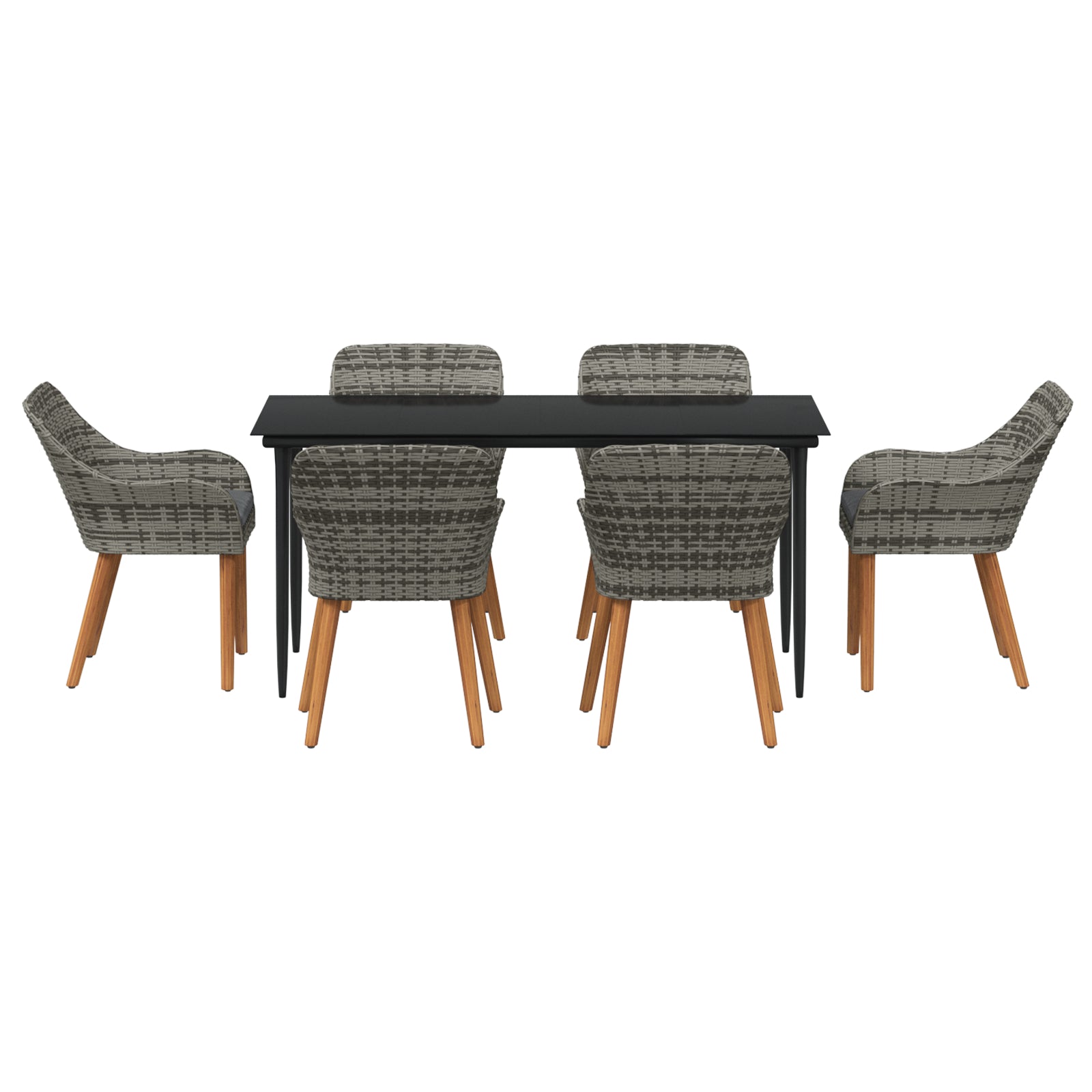 Este elegante conjunto de jantar de pátio junta um visual moderno a um design prático, sendo a escolha perfeita para refeições e entretenimento ao ar livre. Com uma mesa retangular e seis cadeiras, transforma a varanda ou jardim num espaço acolhedor onde amigos e familiares podem reunir-se e desfrutar das refeições juntos.