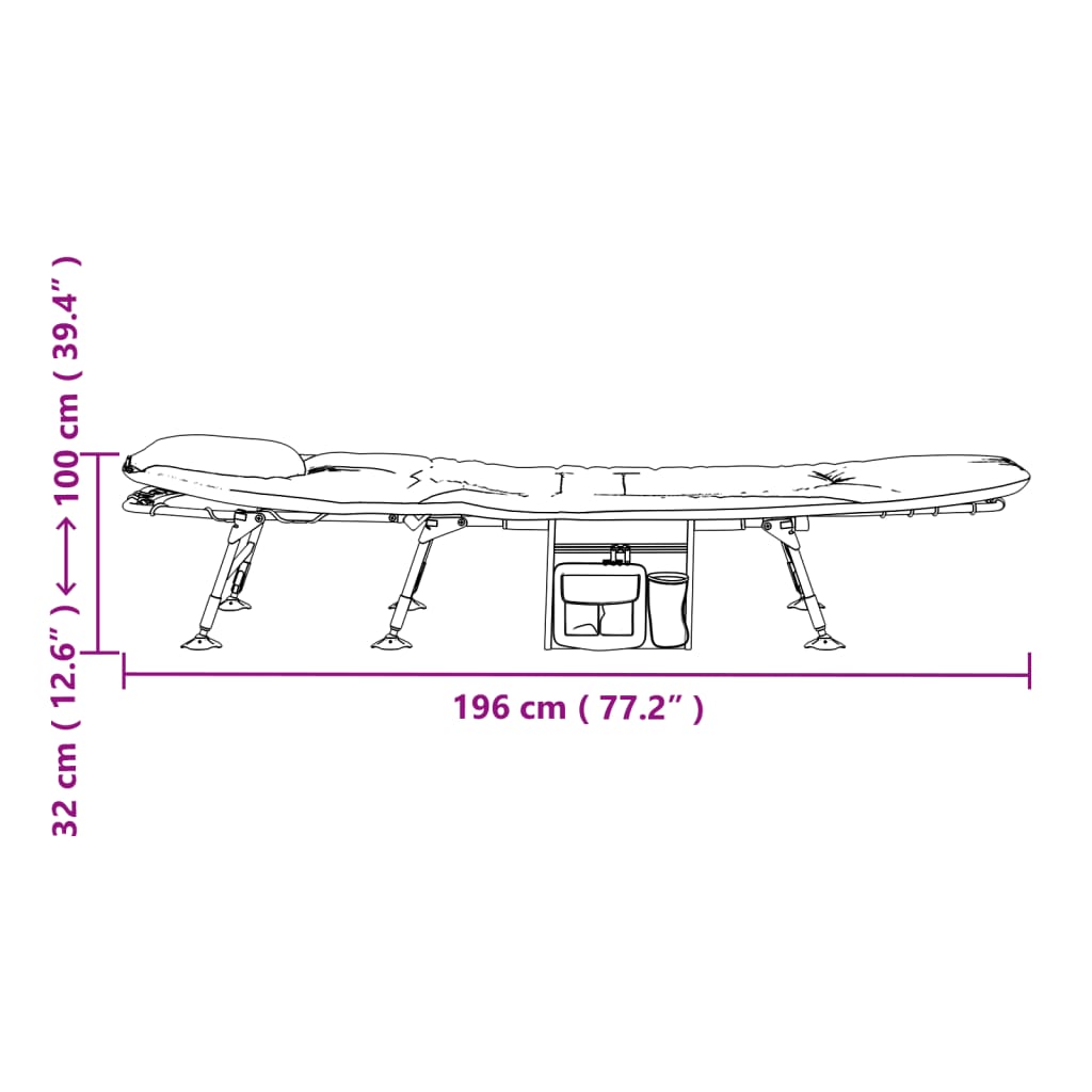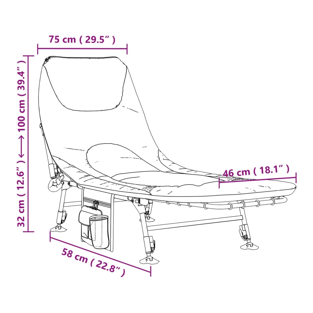 - Design prático: as pernas ajustáveis da espreguiçadeira de pesca estão equipadas com apoios, garantindo uma utilização confortável mesmo em terrenos irregulares e evitando que afundem em solo macio. Além disso, possui um conveniente saco de armazenamento lateral, facilitando a arrumação e o transporte de pequenos artigos.