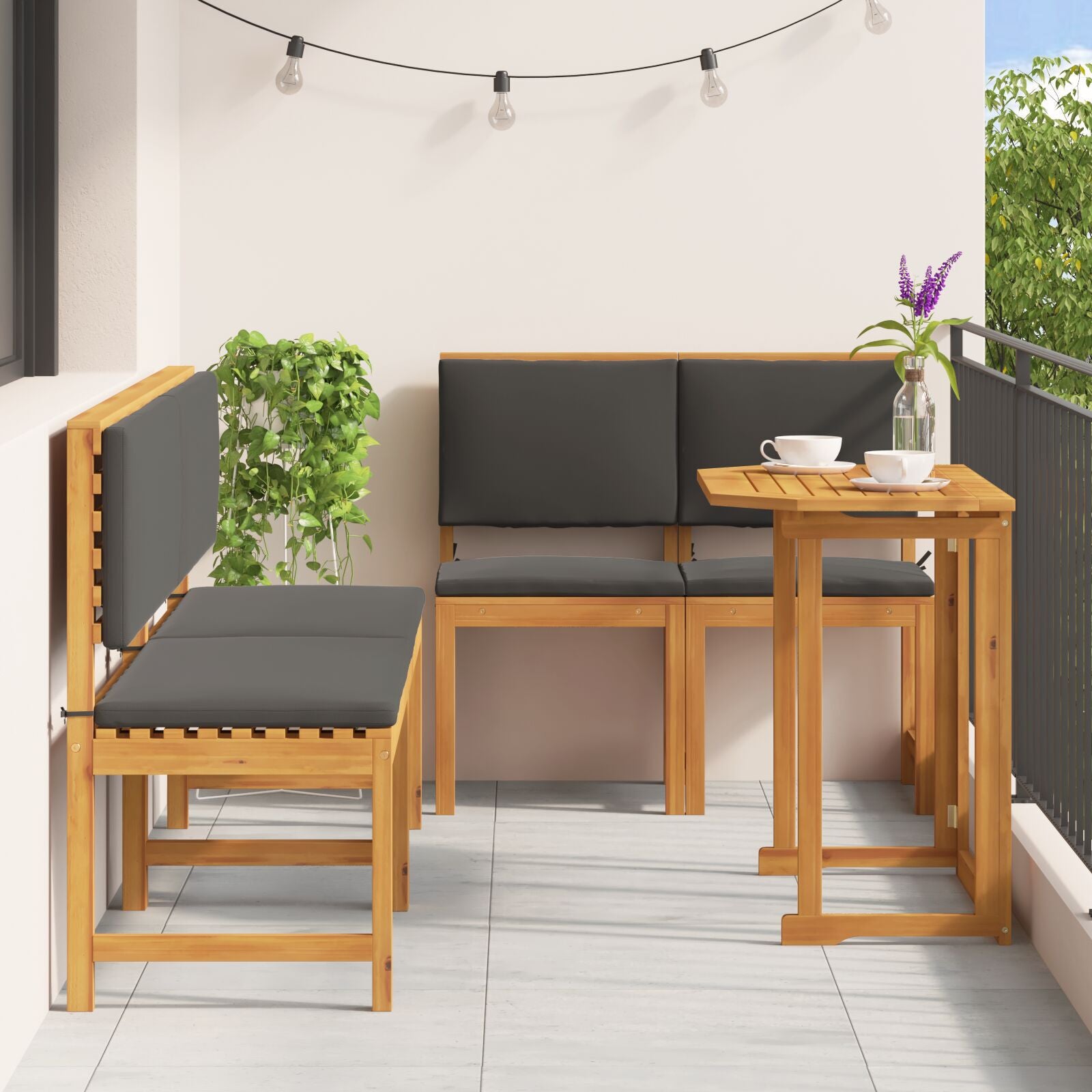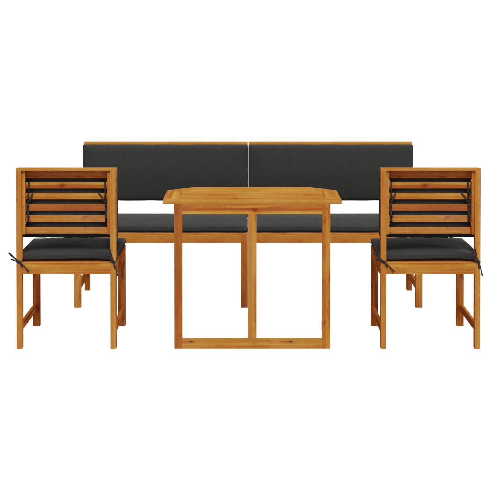 - Madeira de Acácia Natural: Feito em madeira de acácia maciça, este conjunto não só é deslumbrante, mas também está construído para durar e suportar as intempéries, sendo o teu companheiro fiável ao ar livre durante muitas épocas.