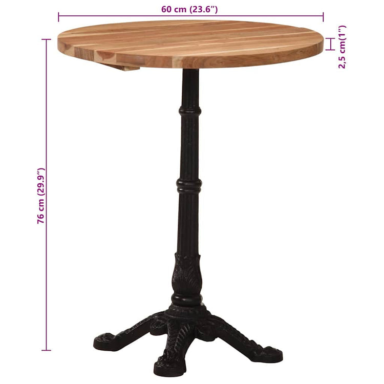 Acrescente um toque de atmosfera romântica com esta mesa de bistrô em madeira! O tampo é feito em madeira de acácia maciça, tornando-o robusto e estável. A base de ferro fundido fornece estabilidade e robustez. Esta mesa de jantar serve inclusive como uma mesa para colocar a sua bebida ou qualquer outro artigo que precise de ter por perto. Nota importante: as cores e os grãos variam de peça para peça, tornando única cada uma das nossas peças. A entrega é aleatória.nan