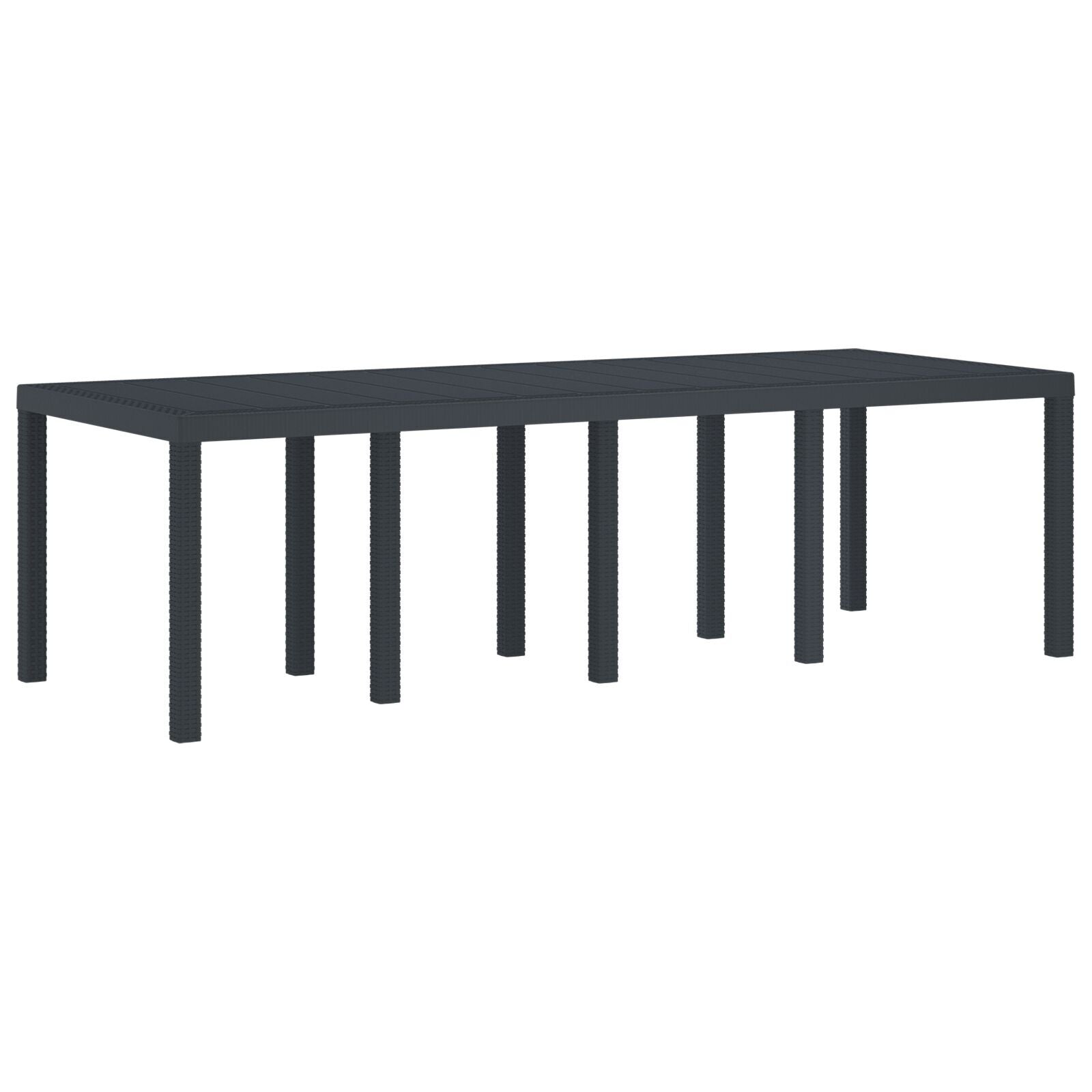 Este conjunto de jantar para jardim é feito de poli rattan resistente e conta com uma mesa retangular espaçosa e dez cadeiras confortáveis. É ideal para refeições ao ar livre. Com o design moderno e a cor antracite escura, traz um toque estiloso a qualquer varanda ou pátio, criando um espaço agradável para encontros, churrascos ou jantares em família.