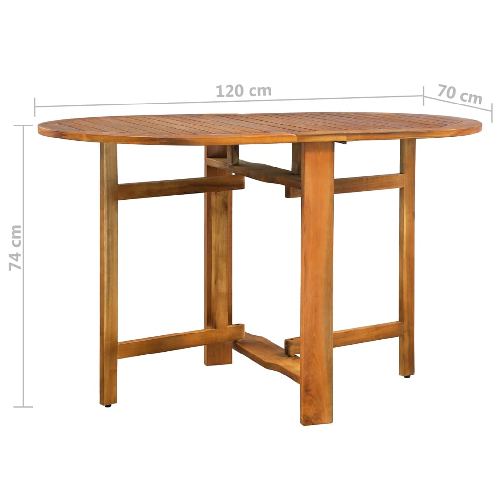 Este conjunto de jantar para exterior é feito em madeira de acácia maciça, uma madeira de lei tropical que é resistente às intempéries e altamente durável. A superfície com acabamento a óleo é fácil de limpar com um pano húmido. A mesa e as cadeiras de pátio podem ser dobradas num tamanho compacto quando não estiverem a ser utilizadas, de forma a economizar espaço.