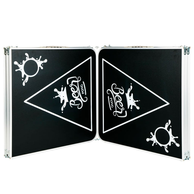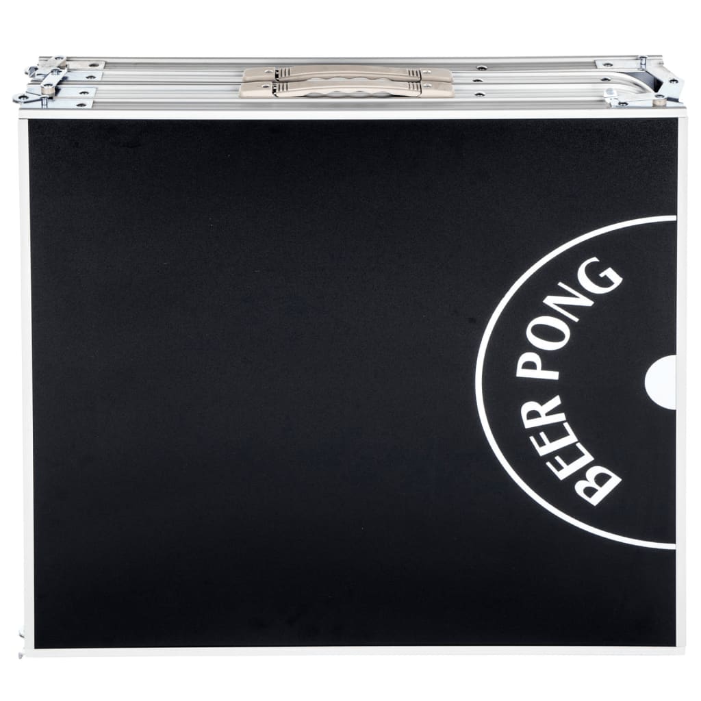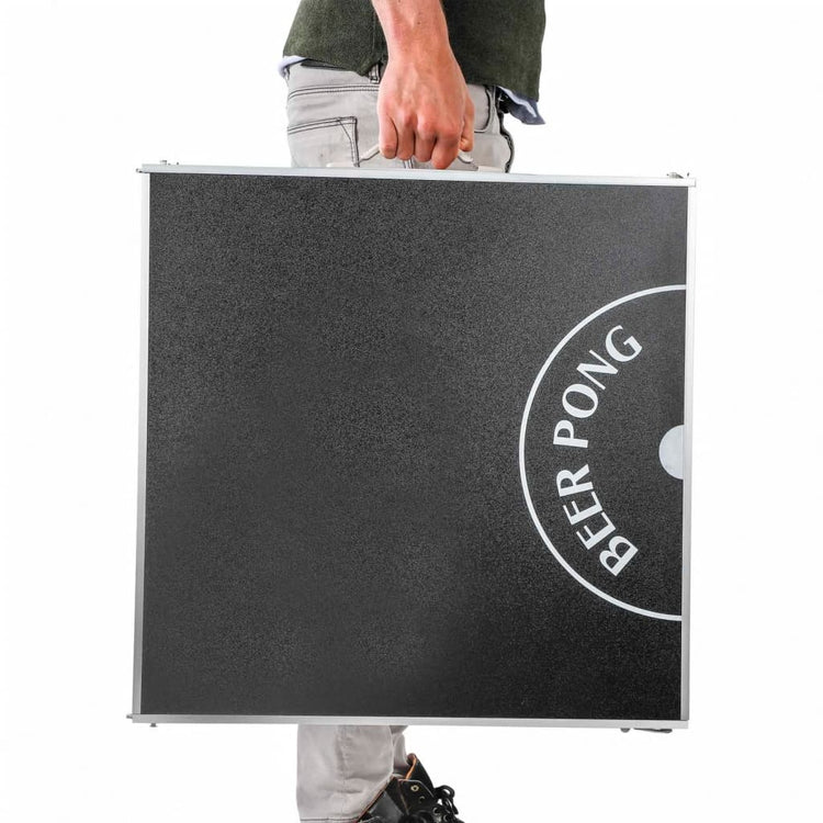 Esta mesa portátil para beer pong é extremamente fácil de instalar, estável e pode ser ajustada em altura entre os 54 e os 76 cm. O tampo em MDF foi finalizado com um logótipo impresso em melamina preta que é resistente a riscos e durável.