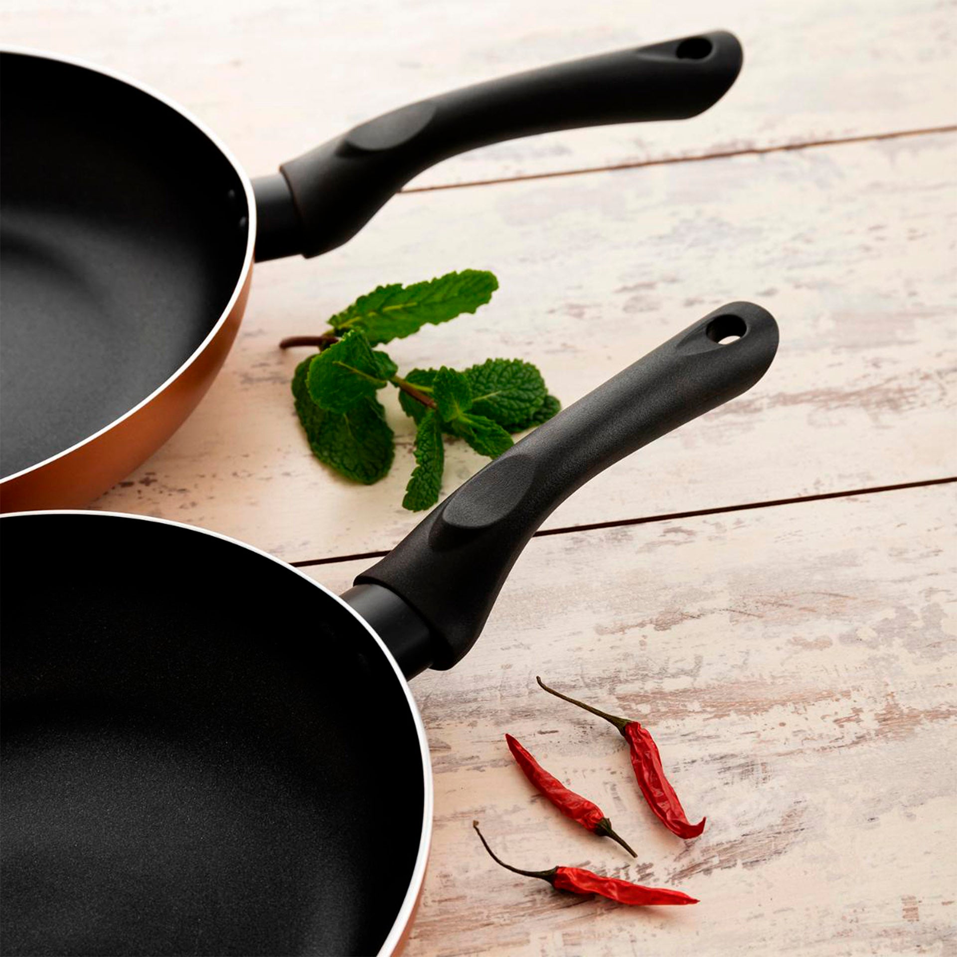 Asas/mango de baquelita de tacto suave. Mango ergonómico. Buena distribución del calor y requiere menos energía. Sartén 22 cm, sartén 26 cm. Apto Vitrocerámica, inducción, eléctrica y gas. Aptas para el lavavajillas.