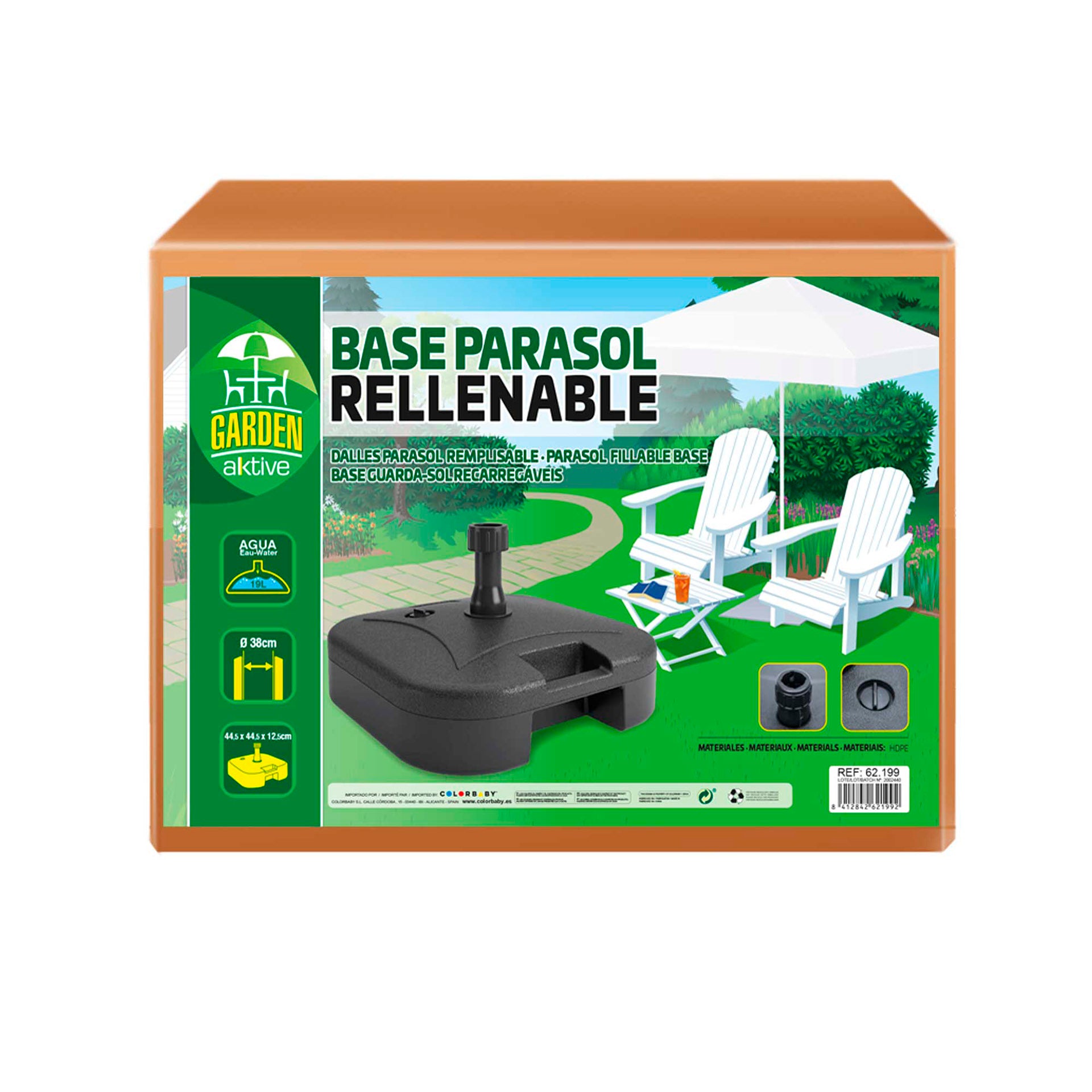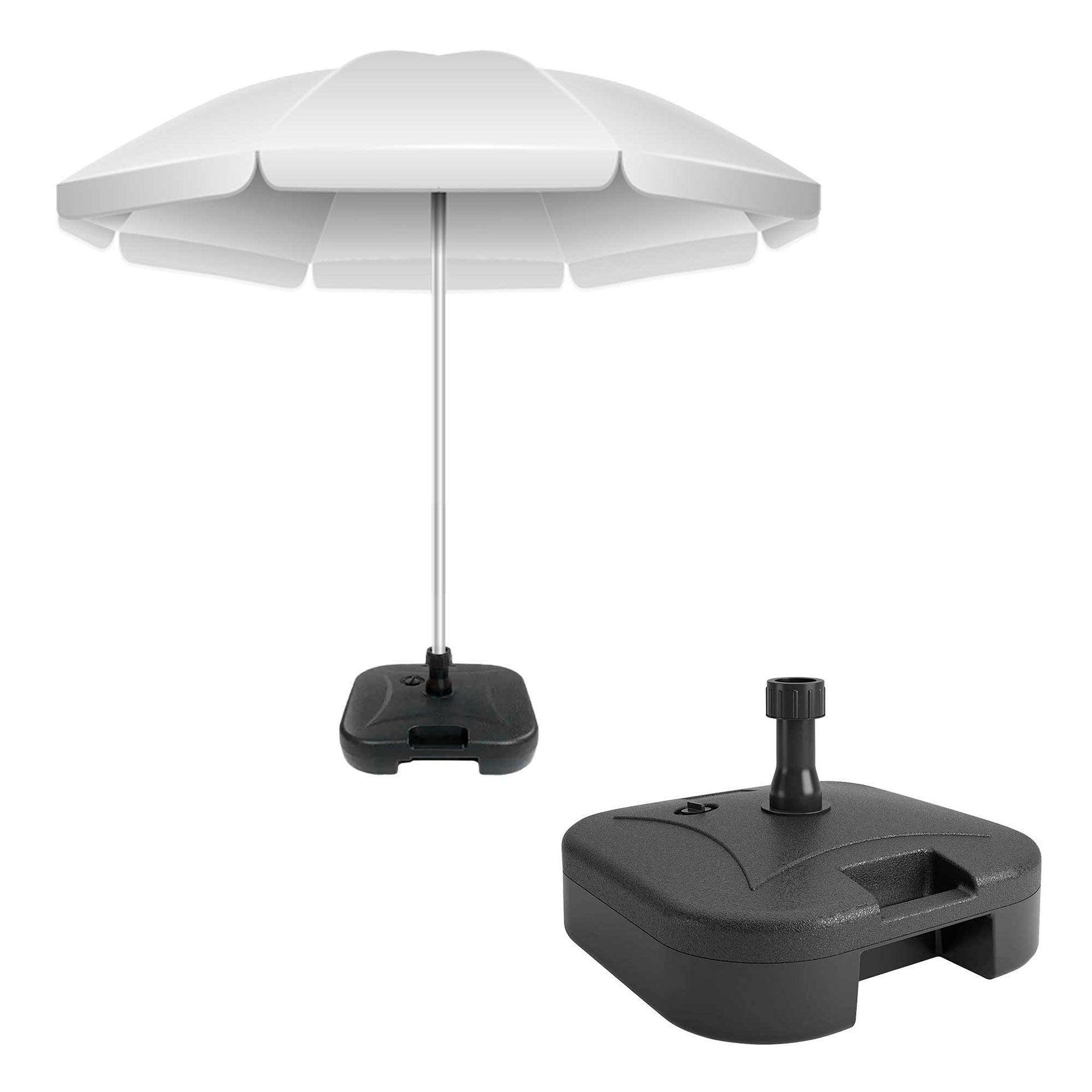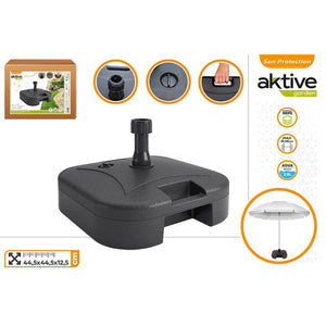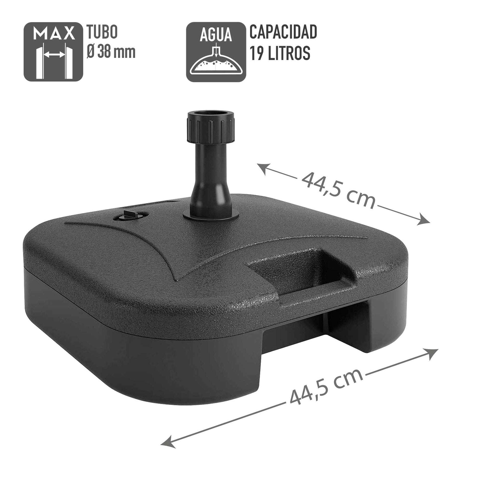Soporte para sombrilla con tubos de hasta 38 mm de diámetro. Se puede llenar con agua hasta 19 litros. Está fabricado en polietileno de alta densidad en color negro y mide 44,5 cm x 44,5 cm de ancho x 12,5 cm de alto. Ideal para tener una zona de sombra en el jardín, en la terraza, en el patio o incluso en el porche de casa. El soporte tiene un práctico asa lateral.