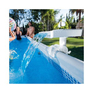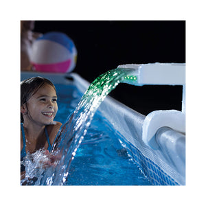 Cascada con luces LED de colores Intex. Medidas: 28x33x29. Para modelos rectangulares y redondos de la línea Metal Frame, Prisma Frame y Ultra Frame. Con brazo ajustable. Funciona conectando la bomba. Diámetro del tubo: 38 mm. Luces LED que cambian de color: rojo, verde y azul. Trabajan con un generador eléctrico. Kit válvula by-pass para regular la presión del agua. Rango de caudal 3596-9274 (950-2450 g/h).