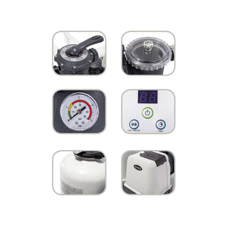 Depuradora de arena INTEX para piscinas desmontables medianas o grandes. Capacidad y potencia: 12.000 L/H de caudal y 550 W de potencia, diseñado para piscinas con un máximo de 66.600 litros. Capacidad del depósito: capacidad para 55 Kg de arena silícea o 38 Kg de arena vítrea de 410 mm de diámetro. Conexión y protección: válvula manual con 6 funciones, programación 24 horas, incluye mangueras de Ø 38 mm, protección contra salpicaduras de agua. Uso y mantenimiento: llenar la piscina con agua hasta cubrir la entrada y salida de agua, la arena se cambia cada 5 años.