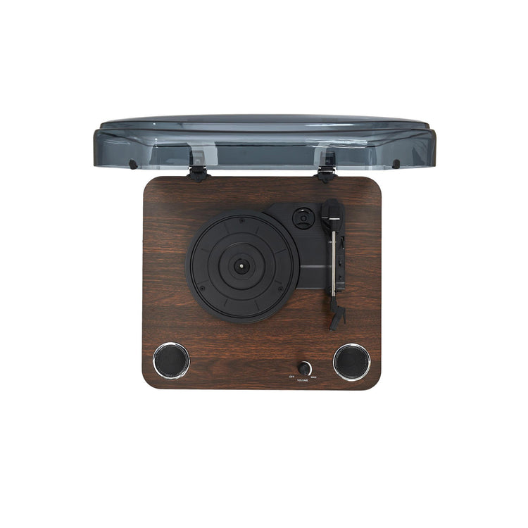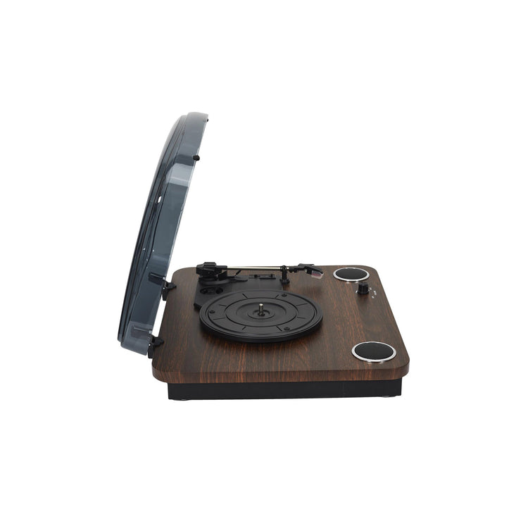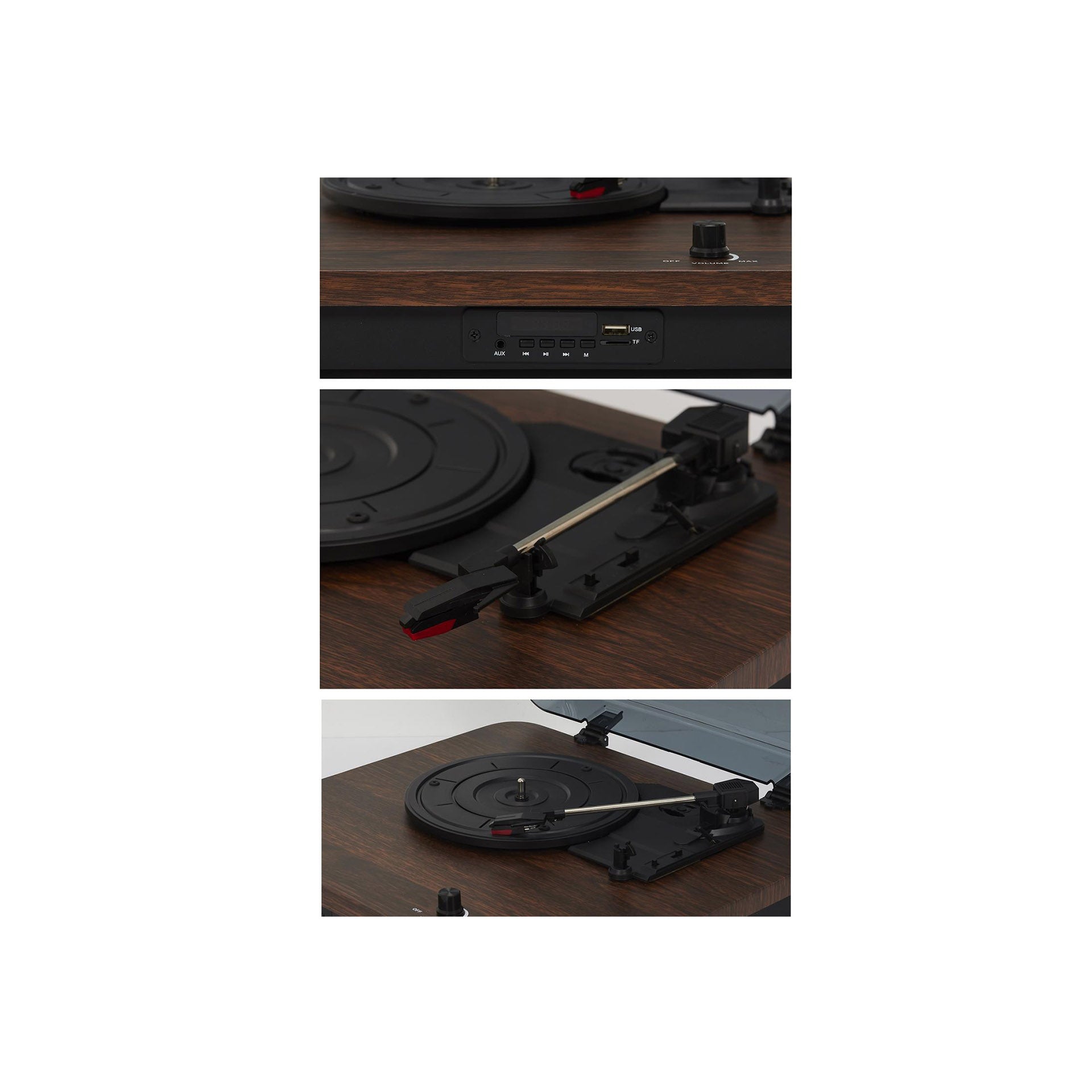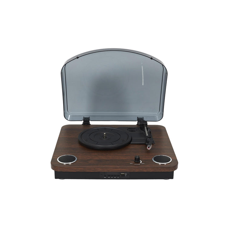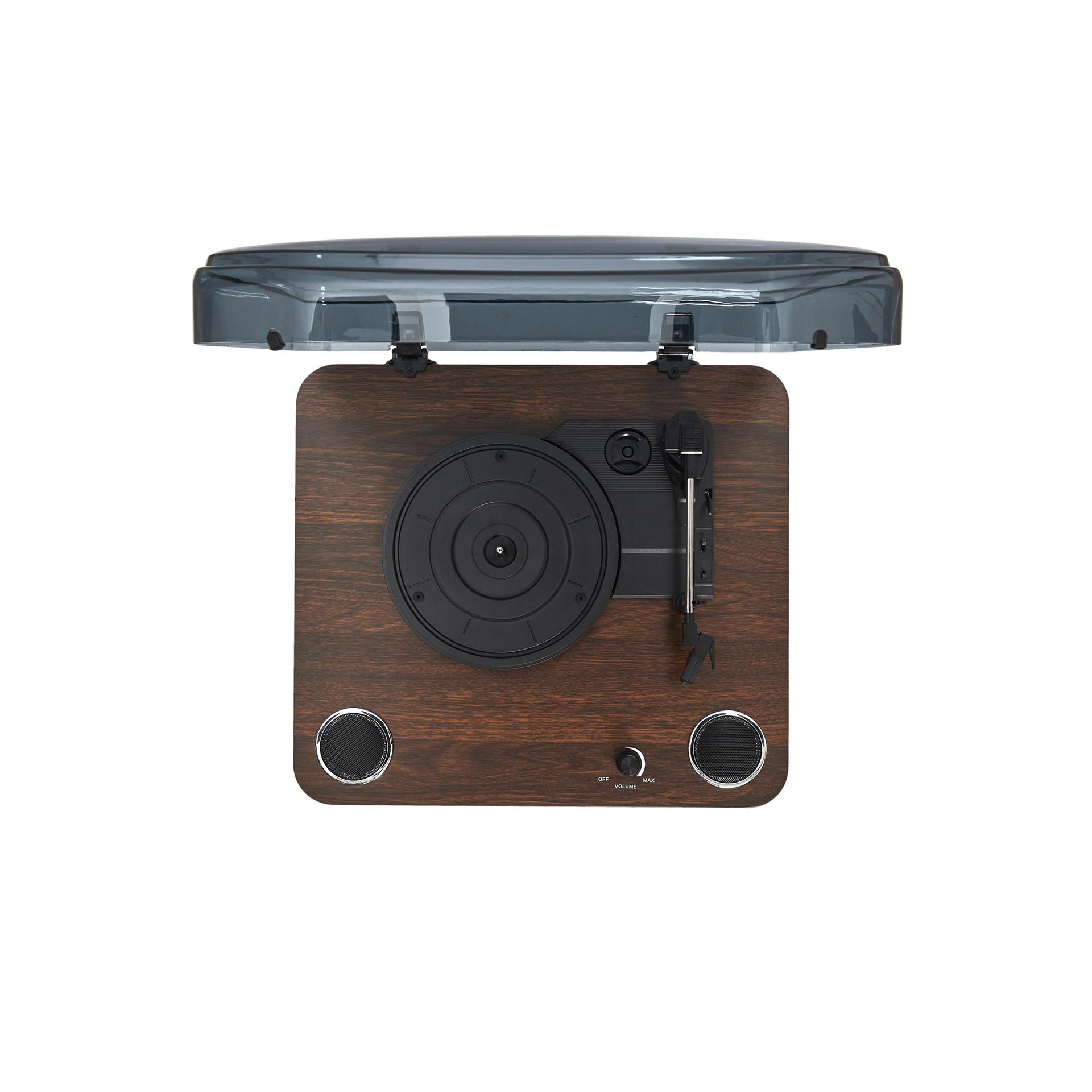 ¡Opta por este tocadiscos de maleta para tus momentos de relajación musical! Altavoces incorporados. Fácil de cargar. Compatibilidad universal con Bluetooth. Puerto USB. Radio FM. Toma jack de 35 mm. Lector de micro SD. Vinilos compatibles con 33, 345 y 78 rpm. Funciona con adaptador de red. Adaptador de 1 RPM a 45 rpm incluido. Cubierta antipolvo incluida. Composición: plástico y madera MDF. Dimensiones: 12x42x39cm.