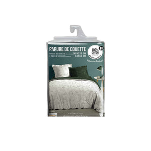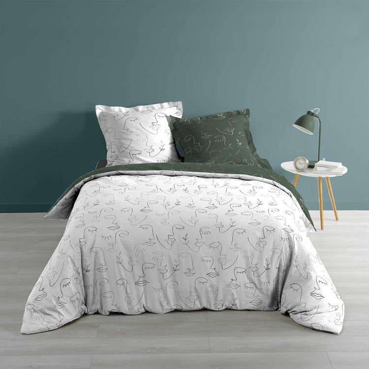 Juego de cama de matrimonio, perfecto para los siguientes colchones: 140x190, 140x200, 150x190, 150x200. Funda nórdica y 2 fundas de almohada. Composición: 100% algodón. Tejido: 57 hilos/cm2. Colores: frontal con estampado de cara minimalista sobre fondo blanco; reverso con estampado de cara minimalista sobre fondo verde. Sublima su decoración interior en un abrir y cerrar de ojos. Funda nórdica con cierre de muelles. 2 fundas de almohada a juego 63x63 cm. Cuidados: lavable a máquina a 40°C, prohibido blanquear, secadora, planchado a temperatura media (150°C), lavado en seco prohibido. Le recomendamos que lave su juego antes del primer uso para garantizar una suavidad óptima.