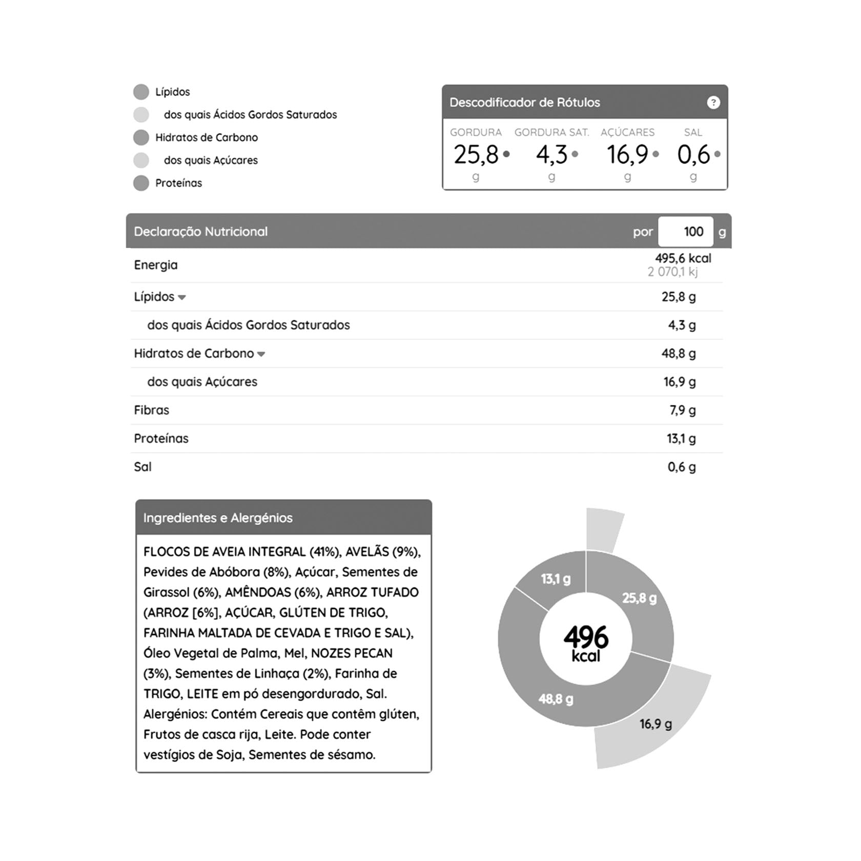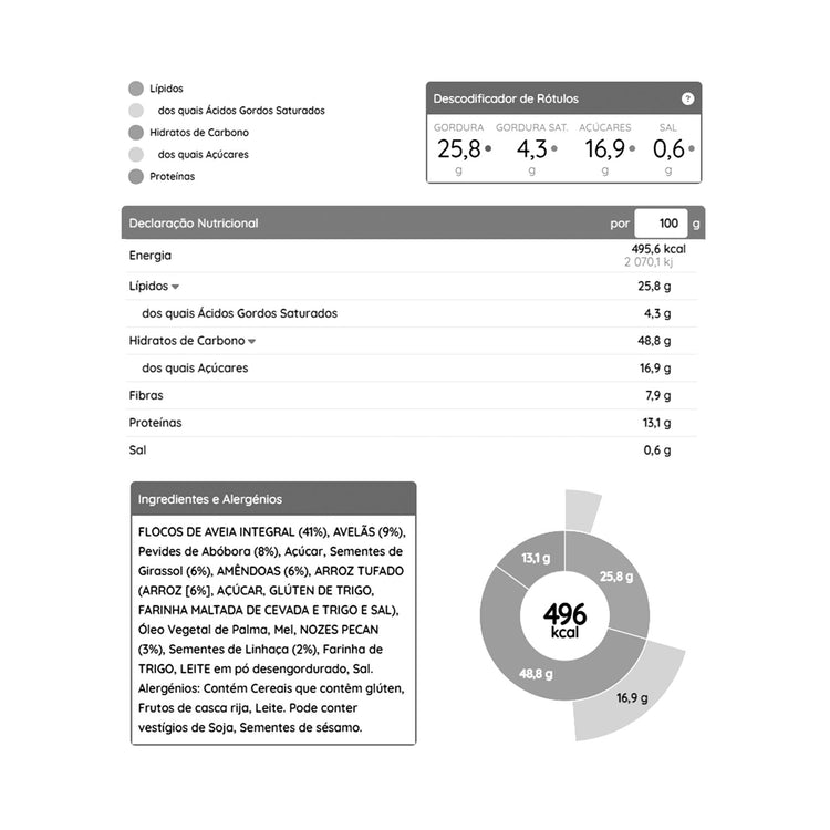 La granola superior se compone de cereales, frutos secos y semillas. Se puede consumir como topping de papillas, tortitas, yogur, leche o batidos, sin necesidad de preparación. Por contener varios tipos de alimentos, de los cuales el 34% son nueces y semillas, es nutritivo, ya que contiene carbohidratos, proteínas y grasas, además de un alto contenido en fibra. Se debe mantener una dieta variada y equilibrada y un estilo de vida saludable.