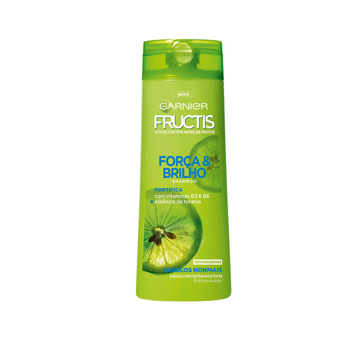 Indicado para cabello normal, el champú fortificante Fructis Força & Brilho combina esencia de pomelo y vitaminas B3 y B6 en su fórmula sin selicona para fortalecer y tonificar el cabello desde la raíz.
