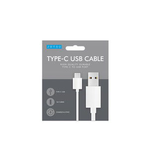 Cabo USB branco adequado para sincronização de dados e carregamento e possui um conector USB Tipo C.