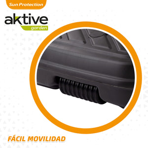 Suporte para guarda-sol Aktive Garden em formato quadrado. Tem um design de cor antracite simples e elegante com relevo. Mede 56 cm de largura, 56 cm de comprimento e 40 cm de altura. É perfeito para guarda-chuvas com hastes de 33 a 48 milímetros de diâmetro, pois o tubo possui rosca ajustável. É feito de poliresina, um material leve, resistente à água e à luz solar. Possui tanque com tampa que pode ser enchido com água (48 l) ou areia (48 kg) e também com roda de 16 cm para facilitar o transporte. Ideal para garantir a estabilidade e sustentação do seu guarda-chuva contra o vento.