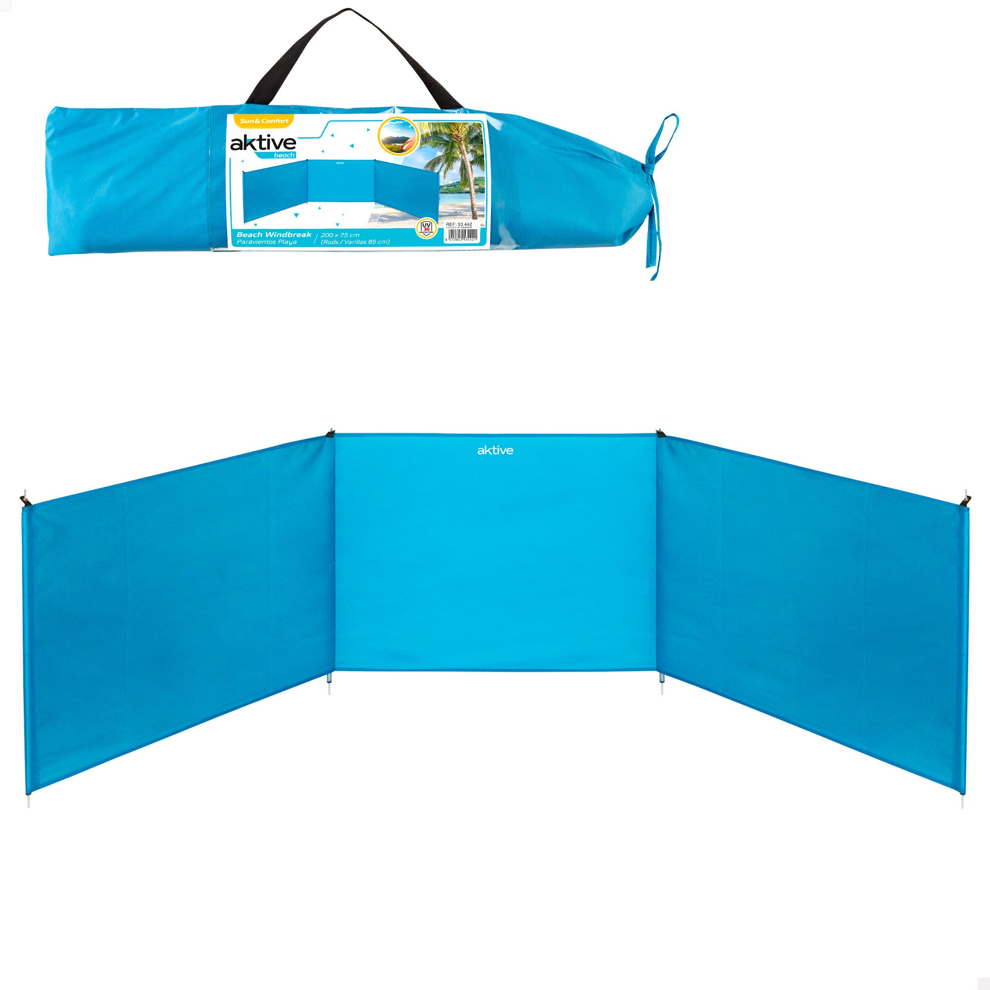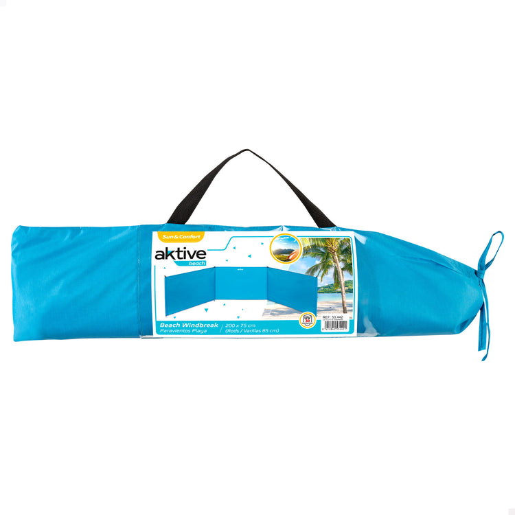 Aproveite seus dias na praia com o pára-brisa Aktive Beach! Ideal para quando sopra vento na praia. O pára-brisa protege dos raios UV 30+ e é à prova d'água. Os bastões são de alumínio e são fáceis de montar. Mede 200x75 cm, perfeito para 2! É de fácil montagem e seu transporte é muito confortável, já que a bolsa onde é guardado tem uma alça para carregá-lo sempre atrás. Quebra-vento para 2 pessoas com medidas de: 200x75 cm Quebra-vento de 3 painéis de poliéster com barras de alumínio Material que expulsa a água 170T de 250 mm Quebra-vento na cor azul com proteção contra raios UV 30+ Inclui bolsa com alças para um confortável transporte