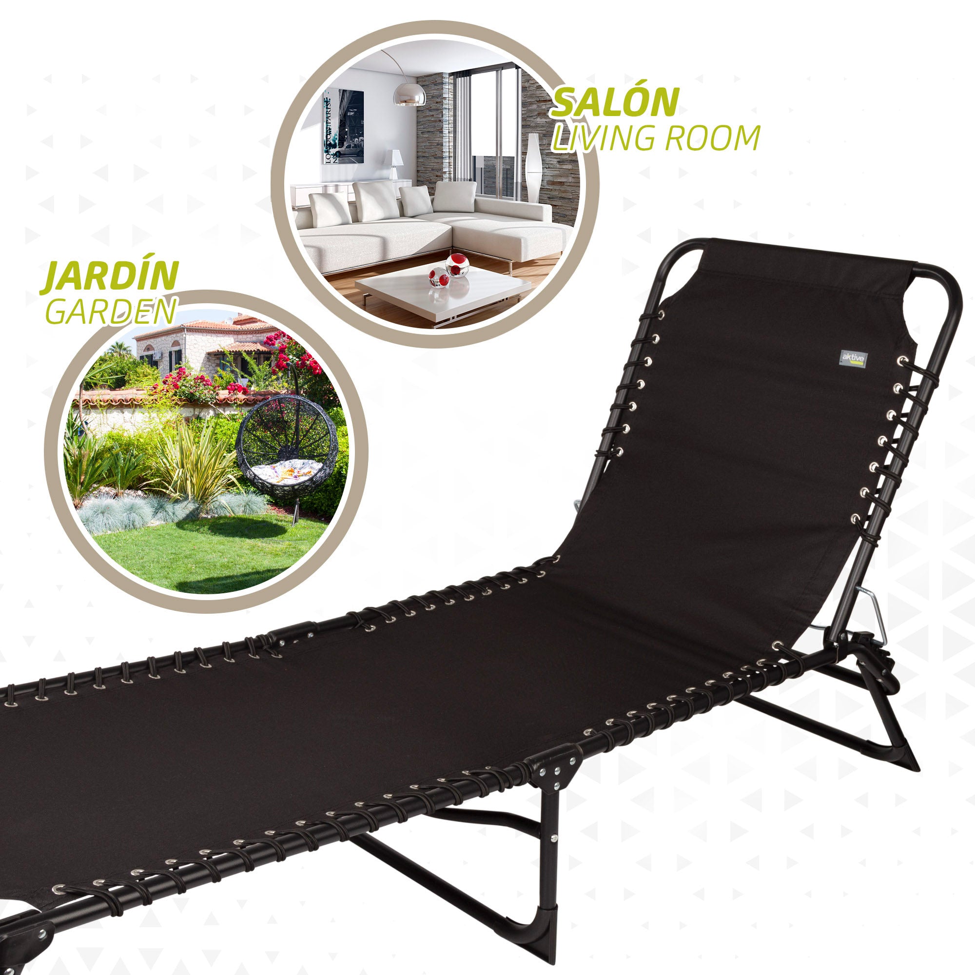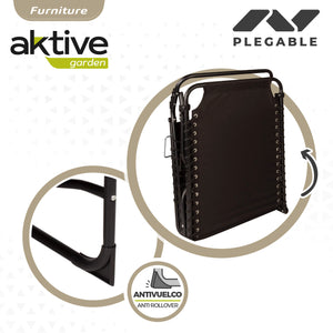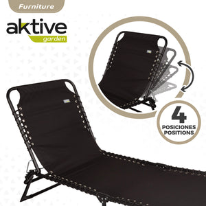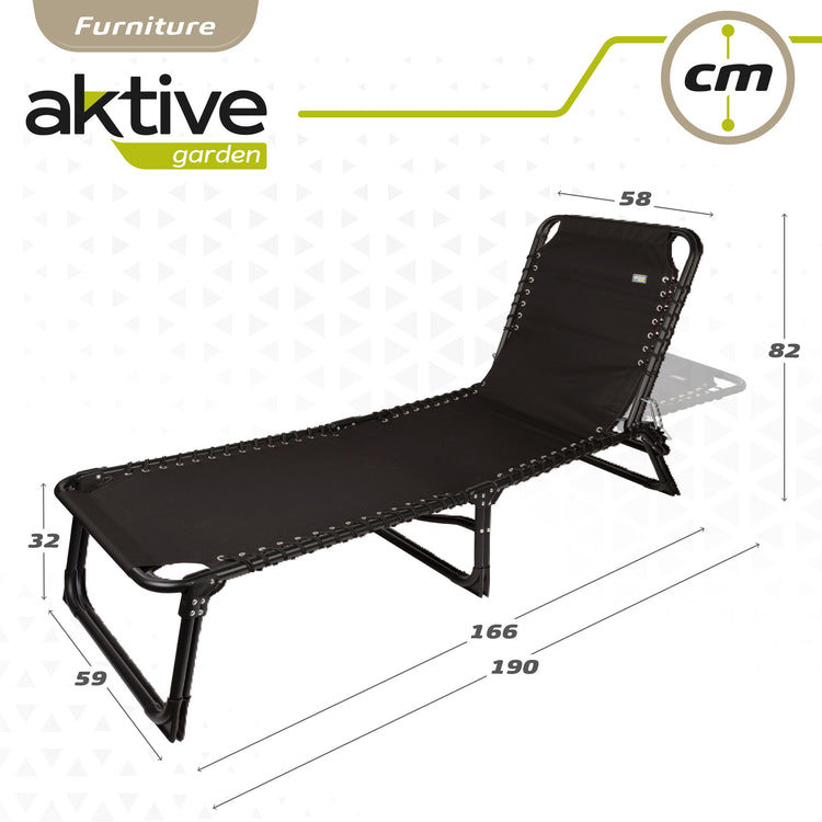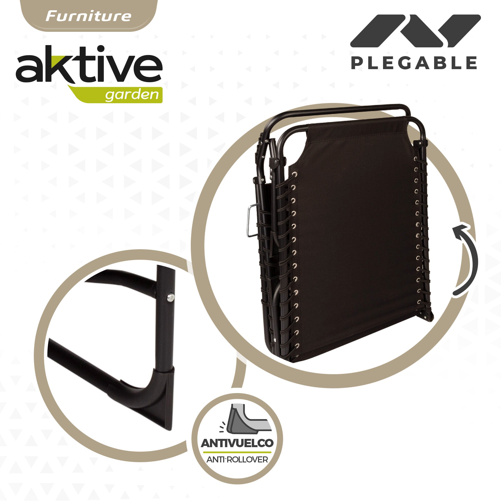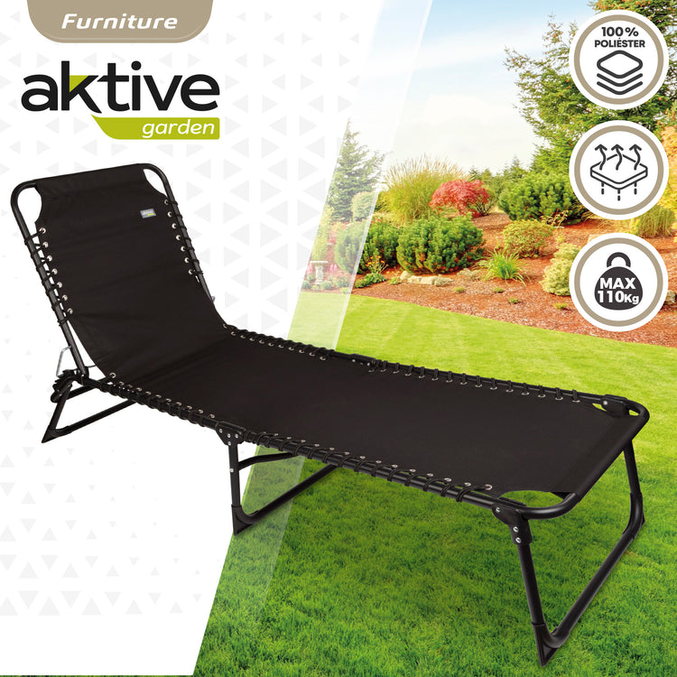 Espreguiçadeira dobrável da linha Aktive Garden, ideal para relaxar ao ar livre. Tem capacidade para 1 pessoa e suporta um peso máximo de 110 kg. Com um design elegante em poliéster preto, um tecido respirável que retém muito bem a humidade e é fácil de limpar, e uma estrutura em tubo de aço. Com encosto multiposições que permite que seja colocado em até 4 posições diferentes. Inclui pés antiderrapantes nas pernas para maior segurança e estabilidade e dobra em uma peça compacta para facilitar o transporte.