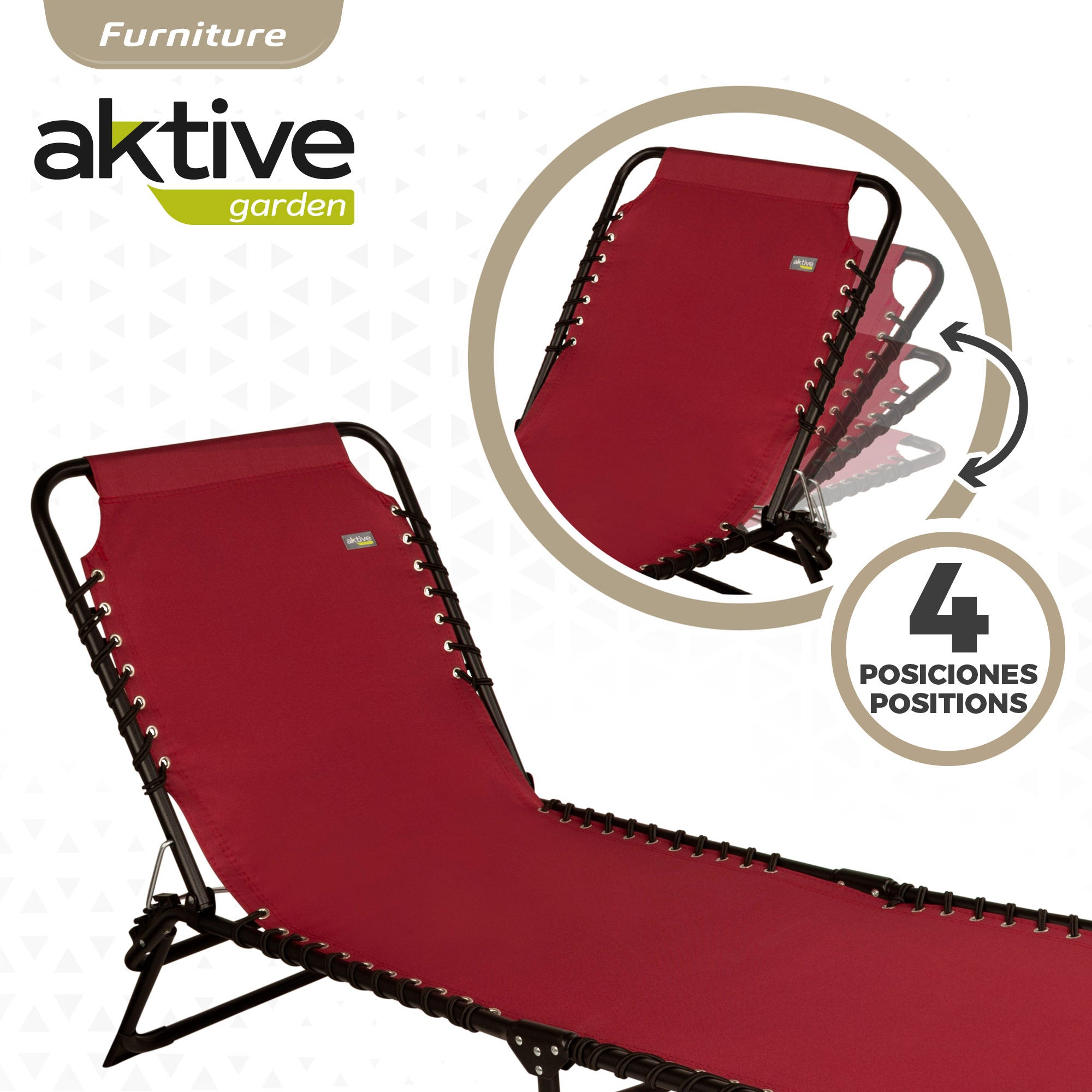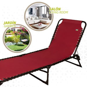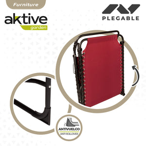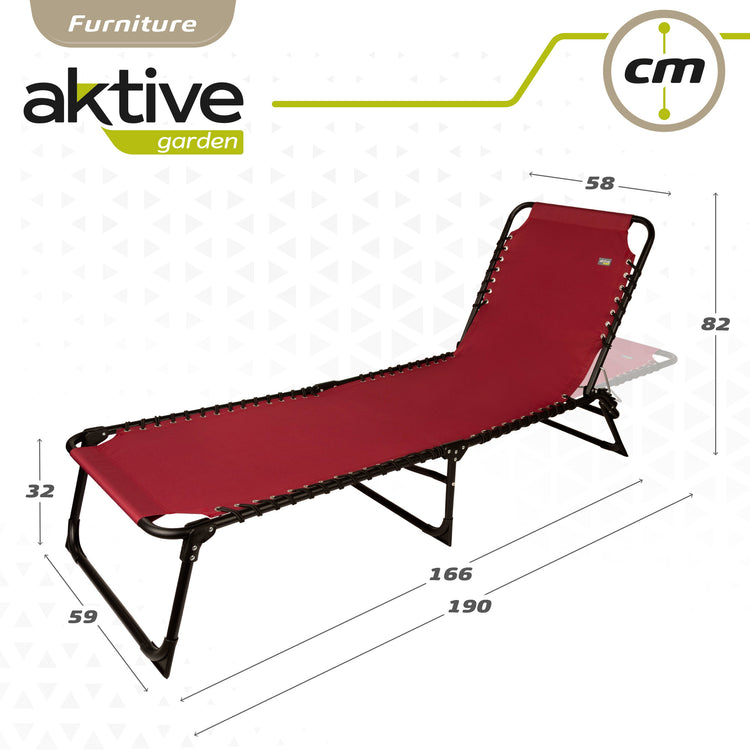 Espreguiçadeira dobrável da linha Aktive Garden, ideal para relaxar ao ar livre. Mede 190x58x32/82 cm, capacidade para 1 pessoa e suporta um peso máximo de 120 kg. Com um elegante design de poliéster vermelho, tecido respirável que retém muito bem a umidade e é fácil de limpar, e uma estrutura de tubo de aço. Com encosto multiposição que permite ser colocado em até 4 posições diferentes. Inclui batentes anti-queda nas pernas para maior segurança e estabilidade e se dobra em uma peça compacta para facilitar o transporte, dando origem a uma peça de 79x60 cm.