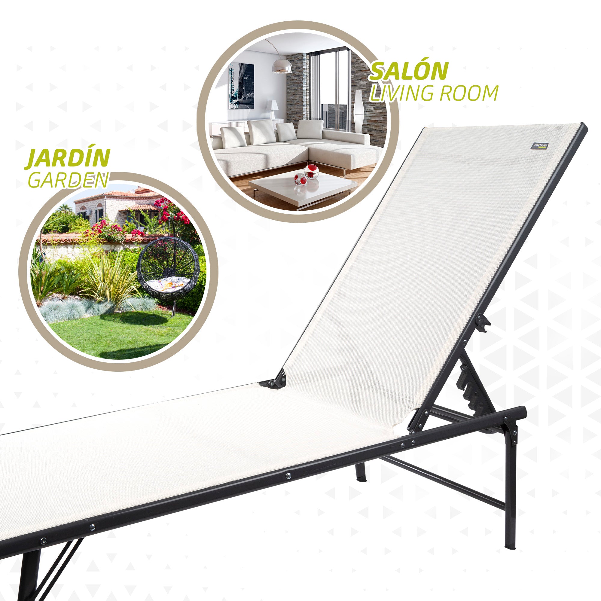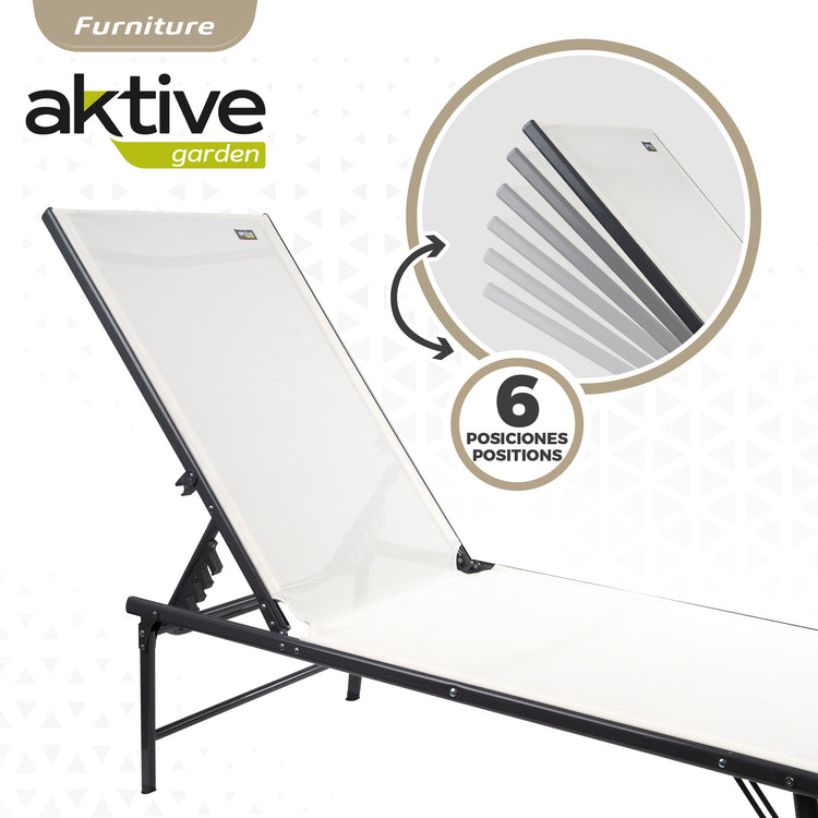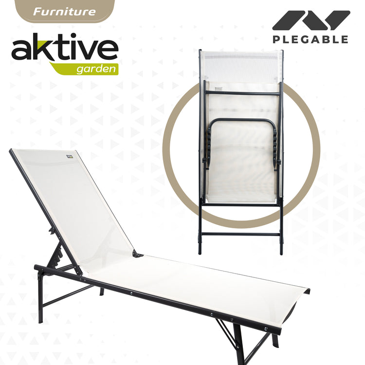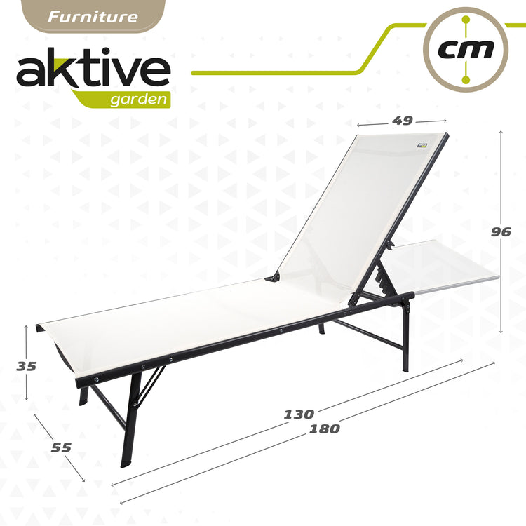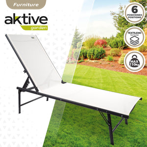 Relaxe com esta espreguiçadeira de jardim Aktive Garden especialmente concebida para desfrutar de momentos únicos de descanso ao ar livre. Trata-se de uma espreguiçadeira feita com estrutura em aço preto (suporta até 110 kg) e tecido têxtil branco, um material de fácil limpeza, impermeável e resistente às intempéries. A espreguiçadeira oferece grande conforto graças ao encosto multiposições fácil de regular (6 posições). Além disso, as pernas incorporam proteções para evitar arranhar ou danificar as superfícies nas quais a espreguiçadeira é colocada. Muito fácil de transportar e guardar. Um elegante modelo de espreguiçadeira que dará um toque de personalidade e estilo ao seu jardim!