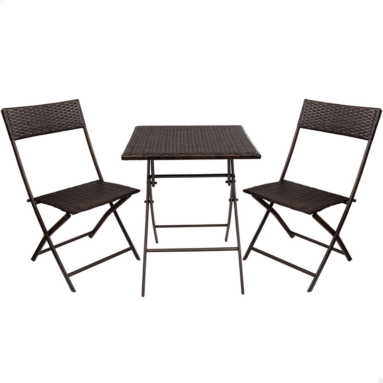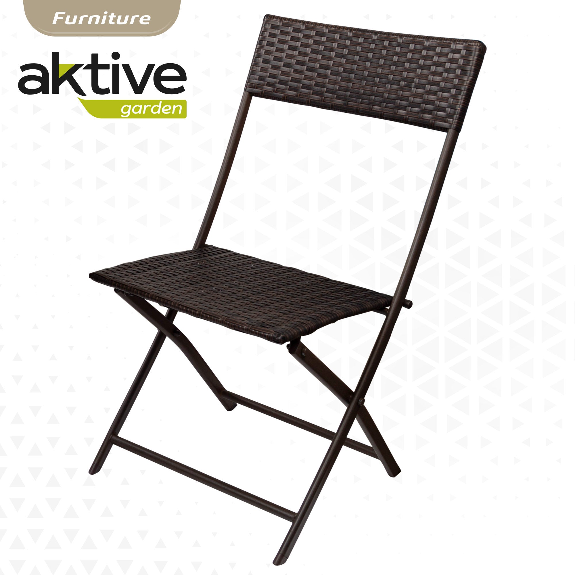 Conjunto de móveis de jardim Aktive Garden composto por duas cadeiras dobráveis e uma mesa central em tons de castanho. Eles são feitos de rattan sintético, um material fácil de limpar, resistente à água e às intempéries, e sua estrutura é feita de aço. Cada cadeira mede 45 cm de largura, 48 cm de comprimento e 83,5 cm de altura; a mesa mede 60 cm de largura, 60 cm de comprimento e 72 cm de altura. Conjunto leve e confortável, ideal para uso em ambientes internos e externos.