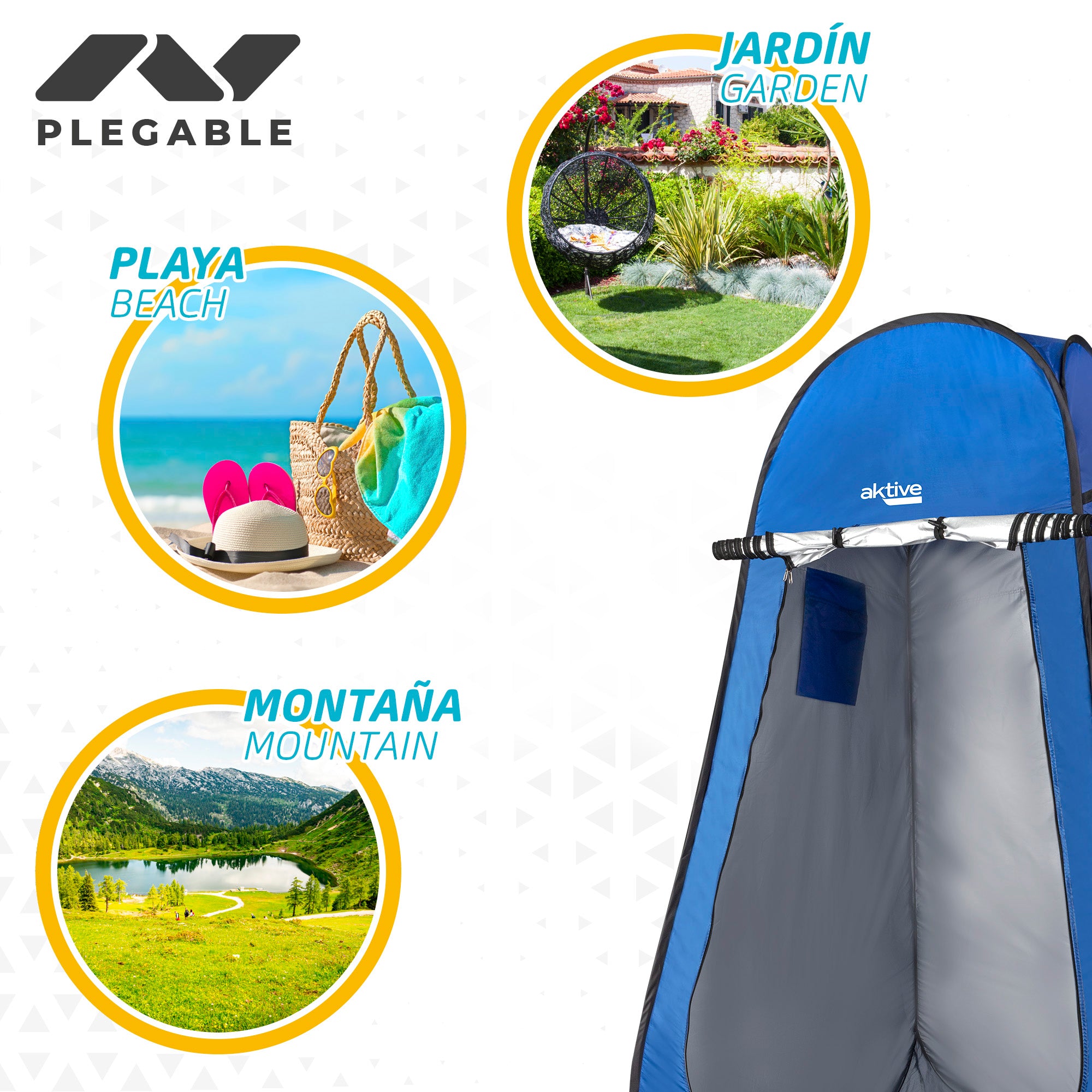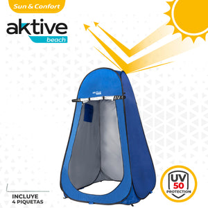 Trocador portátil azul para camping, praia ou montanha Aktive Beach. Mede 120x120x190 cm e é feito de poliéster 170T de alta qualidade. Com forro interno prateado e proteção UV50, o trocador possui bolso interno prático e porta de enrolar com duplo zíper. O trocador não tem fundo para mantê-lo limpo. Inclui 4 pinos e bolsa de transporte.