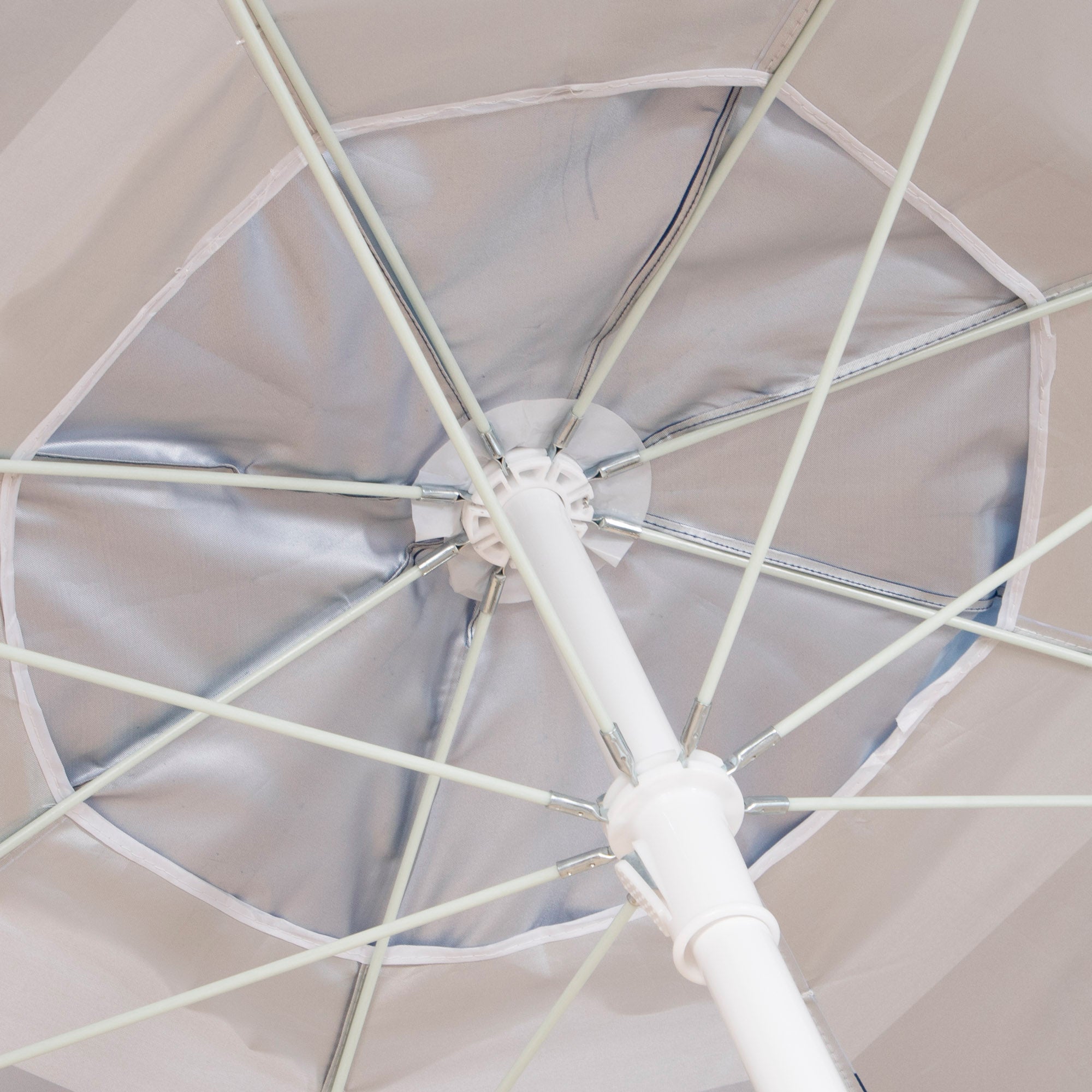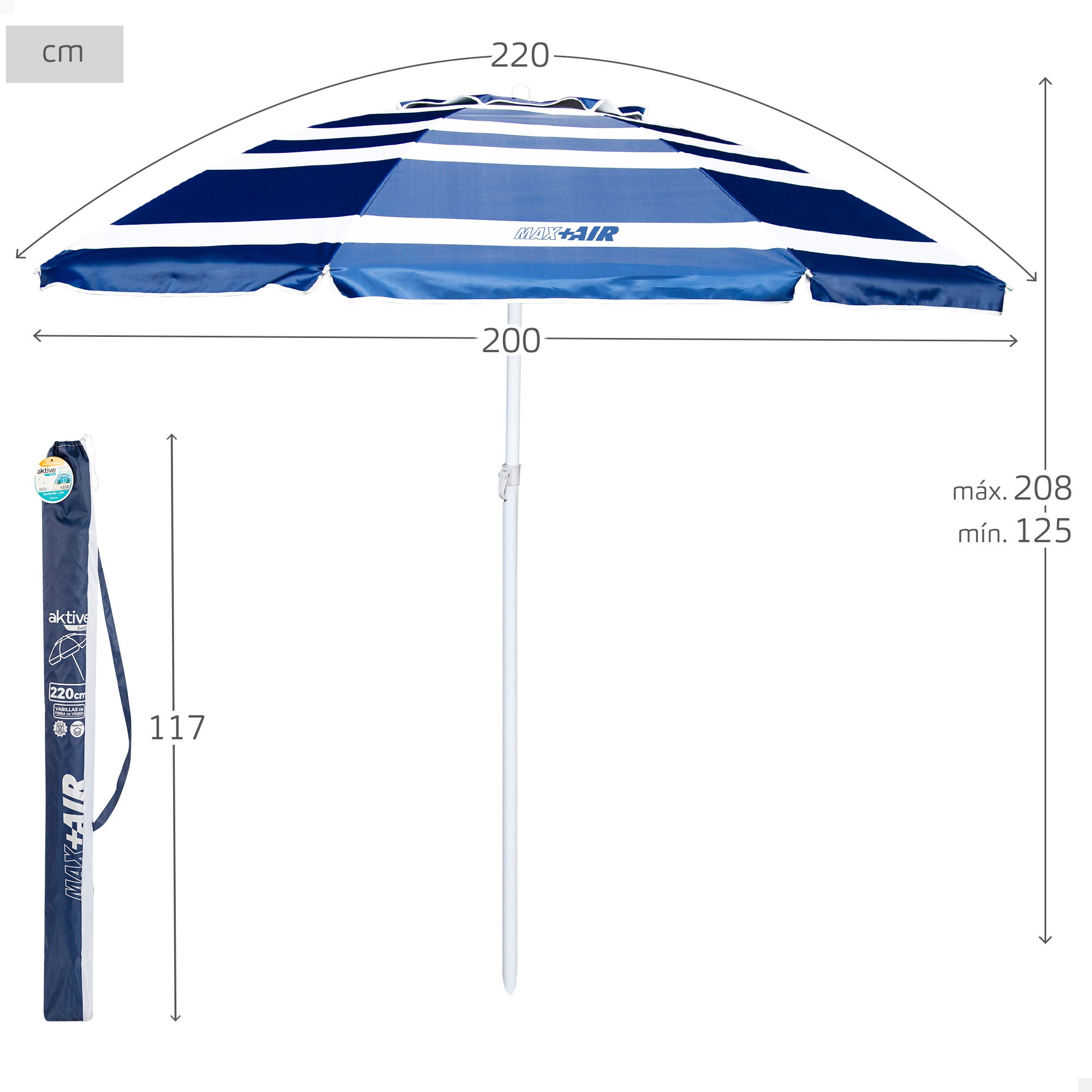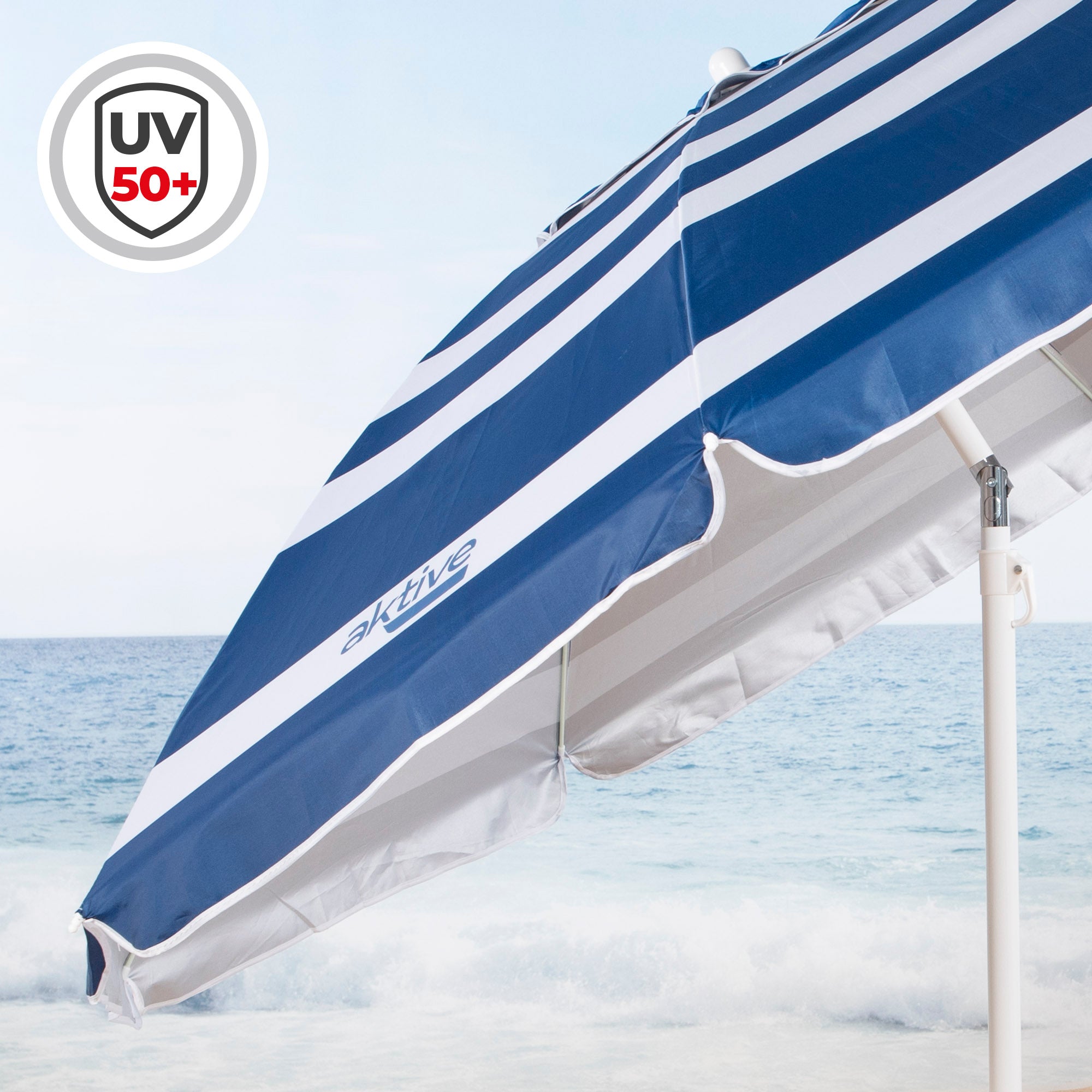 Guarda-chuva de praia à prova de vento de alta qualidade Max Air da Aktive Beach. O guarda-chuva é de forma octogonal e tem um design estilo marinheiro listrado de azul e branco com uma haste branca. Sua proa tem 220 cm de diâmetro e seu mastro regulável em altura tem 28/32 mm de diâmetro. O guarda-sol é confeccionado em tecido de poliéster, possui revestimento prateado com proteção UV50 e sua haste é de alumínio. Uma das características que o tornam especial é a sua resistência ao vento graças à ventilação na parte superior e às suas 8 hastes flexíveis em fibra de vidro. Além disso, seu mastro de alta resistência é inclinável, de modo que o guarda-chuva pode ser orientado de acordo com a posição do sol. Inclui armazenamento correspondente e bolsa de transporte com alça de ombro.