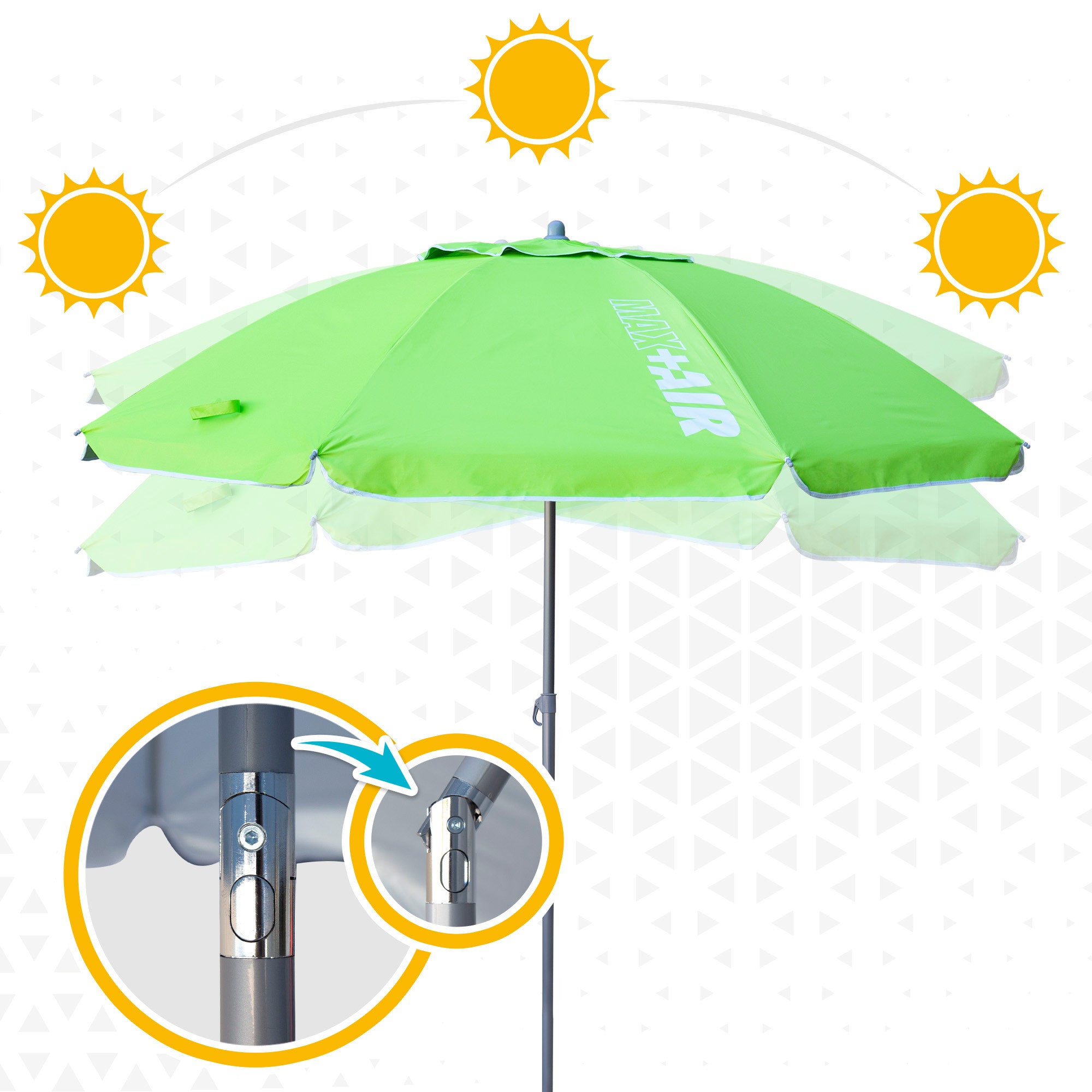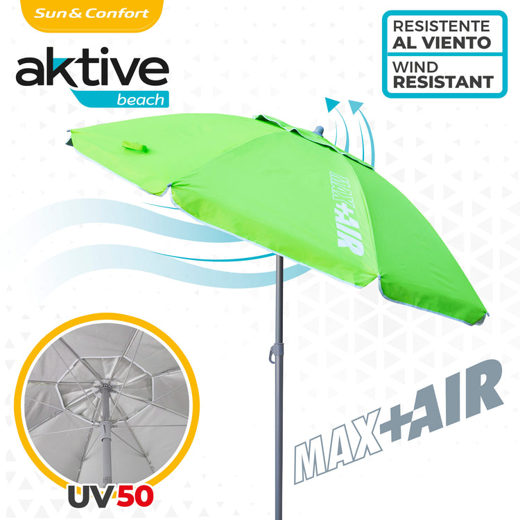 Guarda-chuva de praia à prova de vento Max Air de alta qualidade Aktive Beach. O guarda-chuva tem formato octogonal e tem um tecido verde e um poste branco. Sua proa tem 200 cm de diâmetro e seu mastro regulável em altura tem 28/32 mm de diâmetro. O guarda-chuva é confeccionado em tecido de poliéster, possui revestimento prateado com proteção UV50 e sua haste é de aço. Uma das características que o tornam especial é a sua resistência ao vento graças à ventilação na parte superior e às suas 8 hastes flexíveis em fibra de vidro. Além disso, seu mastro de alta resistência é inclinável, para que o guarda-chuva possa ser orientado de acordo com a posição do sol. Inclui armazenamento correspondente e bolsa de transporte com alça de ombro.