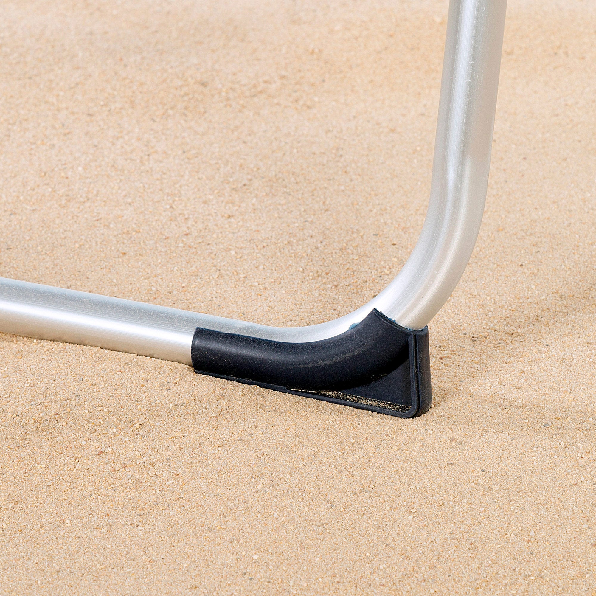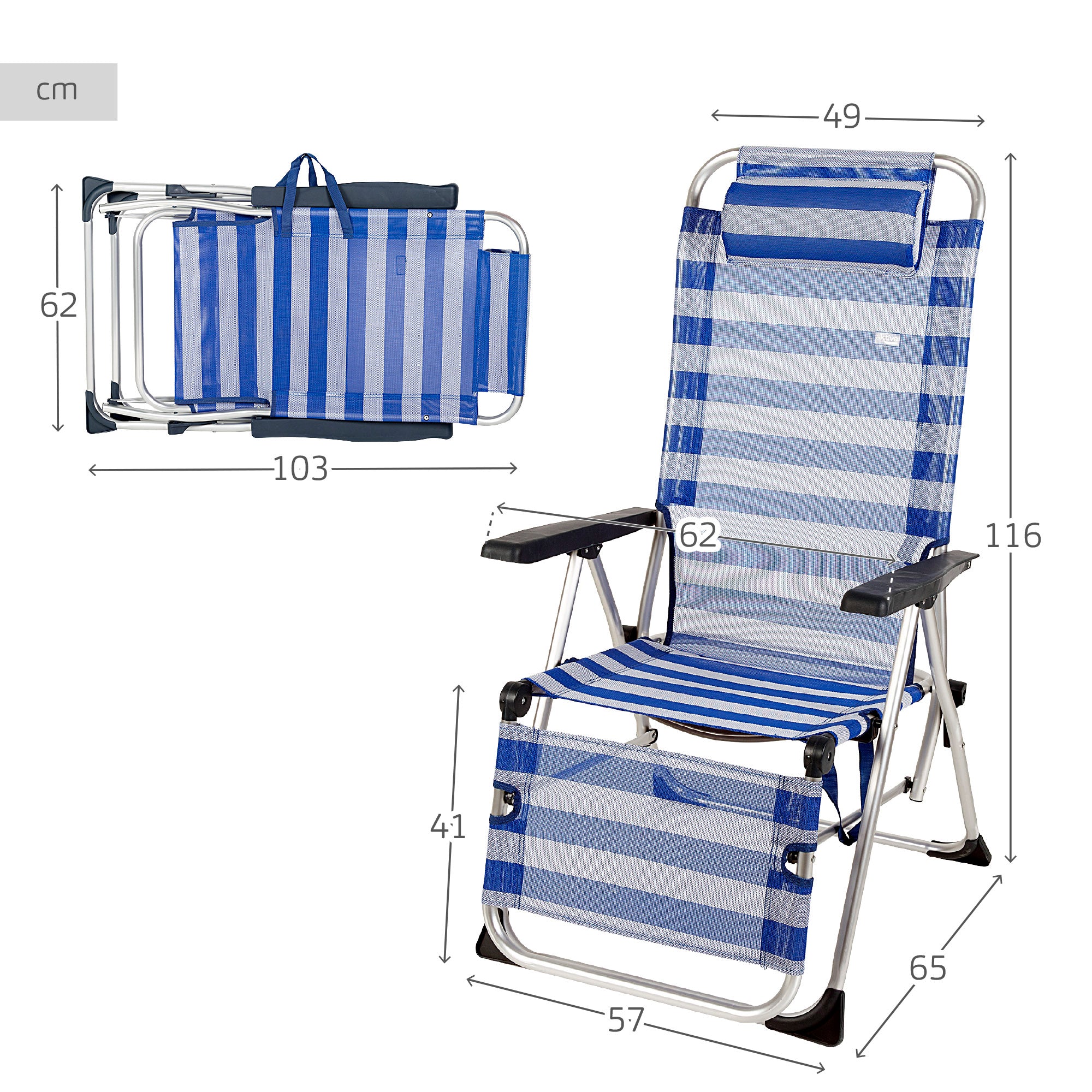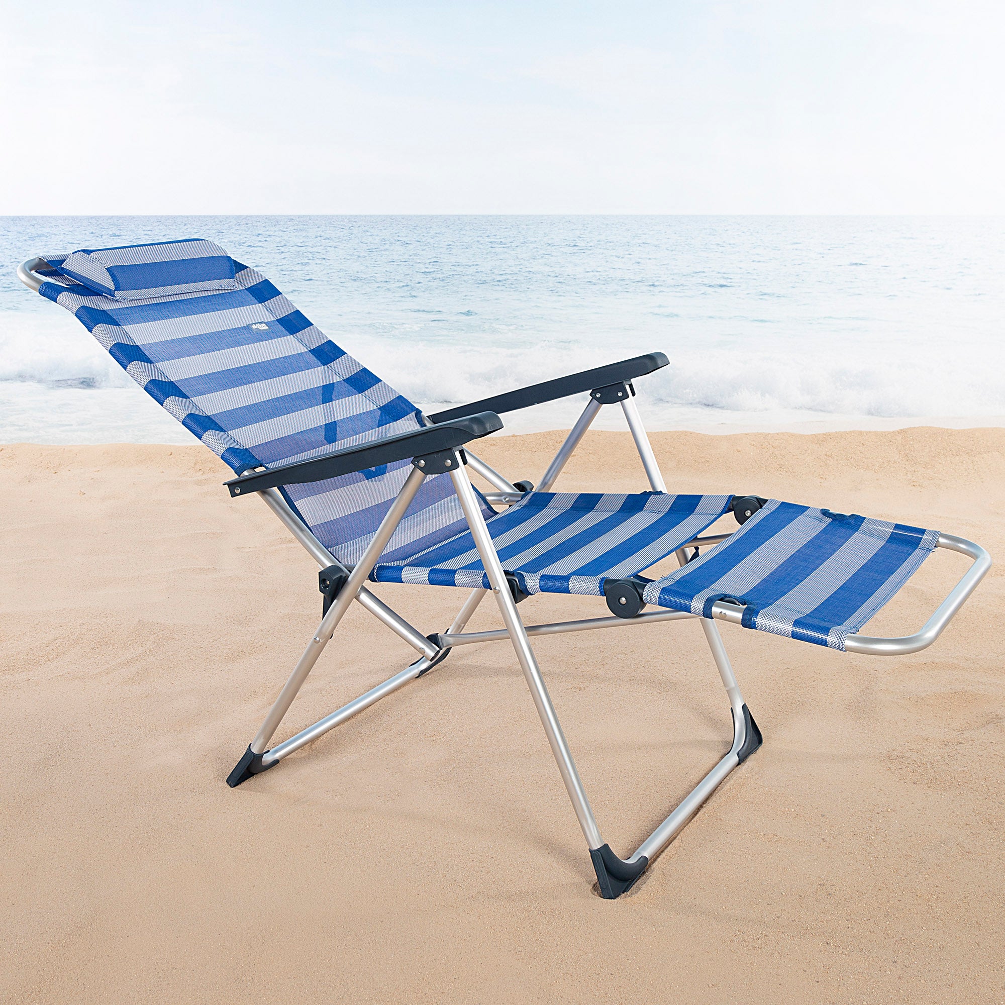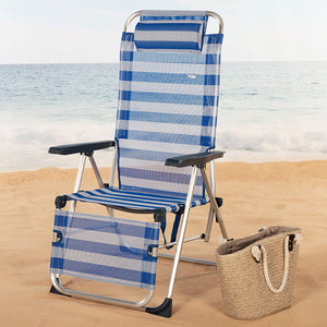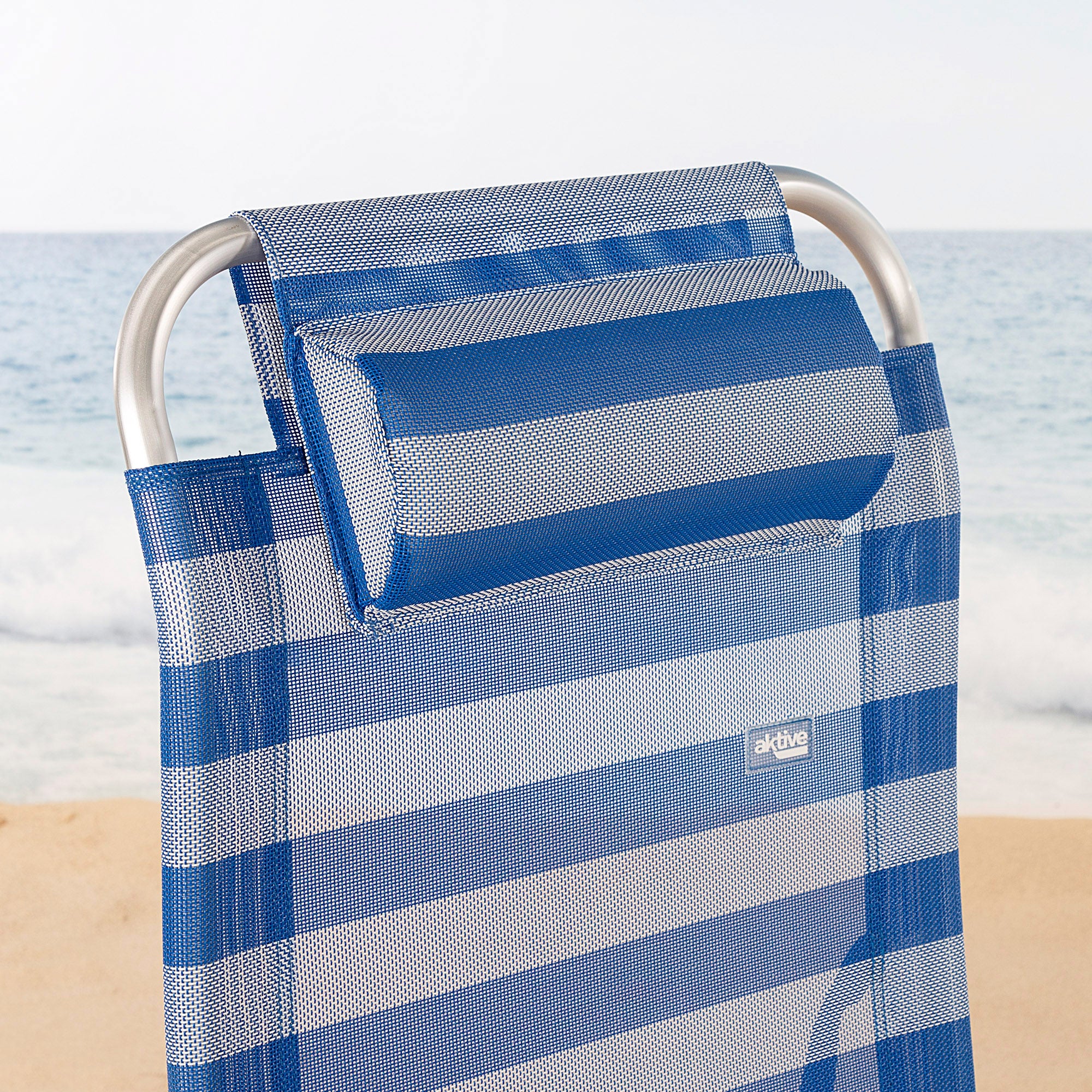 Cadeira de praia Aktive Beach projetada para desfrutar de momentos de relaxamento enquanto toma banhos de sol na praia. É confeccionada com estrutura em alumínio prateado (suporta até 110kg), tecido textil listrado azul e branco e apoios de braços ergonômicos em plástico resistente azul marinho. A cadeira oferece grande conforto graças à sua almofada acolchoada e encosto reclinável e pés que podem ser facilmente ajustados em 5 posições com os apoios de braços. Para maior estabilidade e segurança durante o uso, as pernas incorporam batentes anti-inclinação e, graças à sua alça moldada, é muito fácil de transportar, armazenar e empilhar.