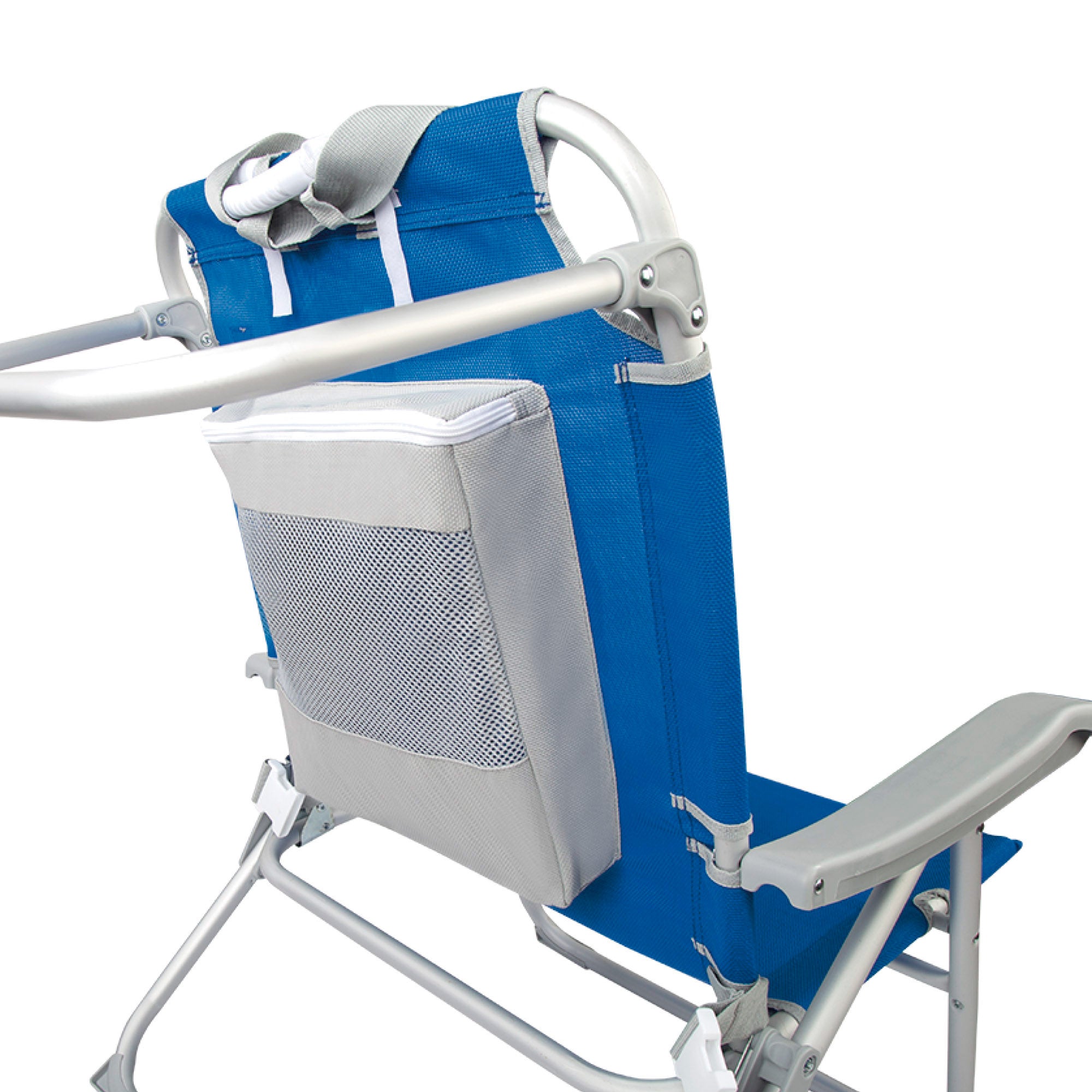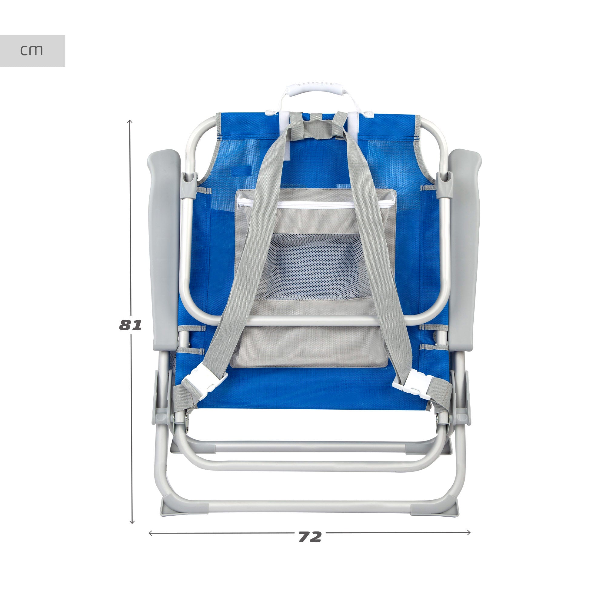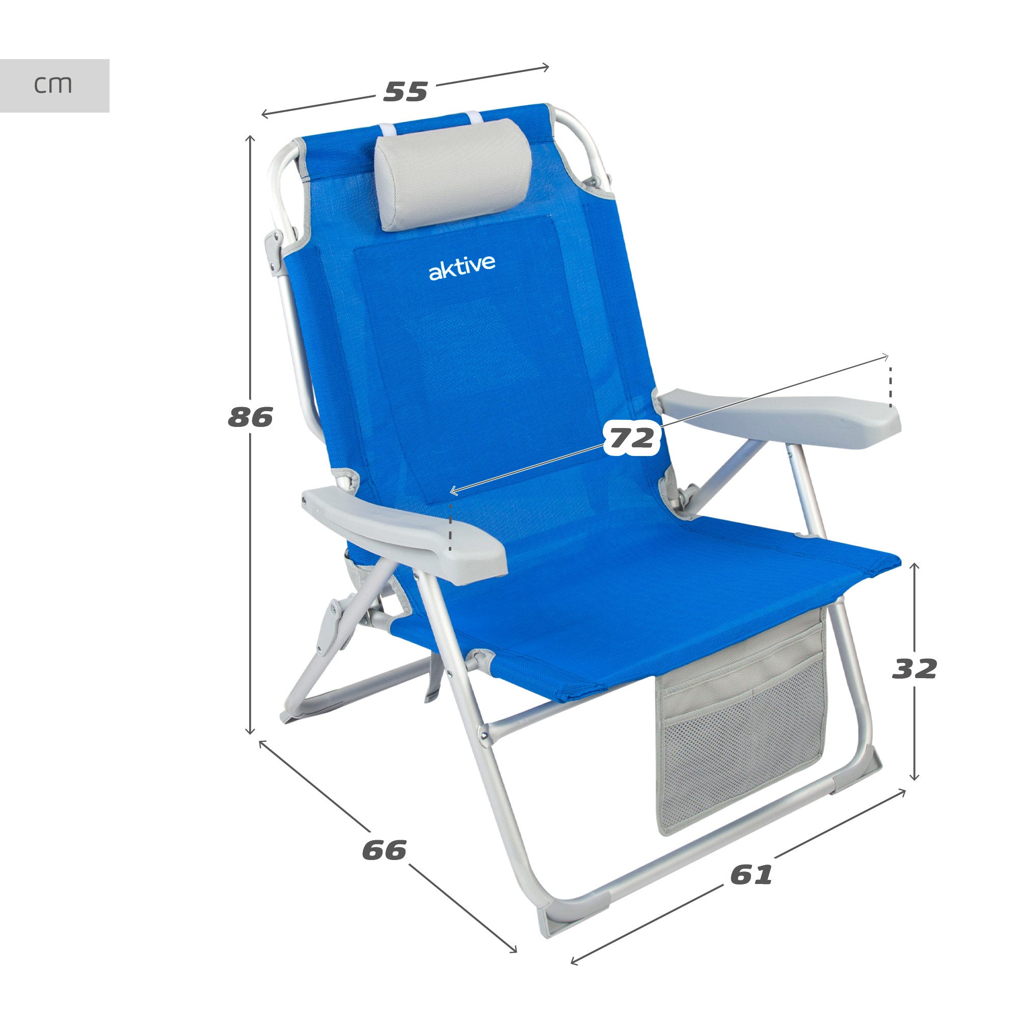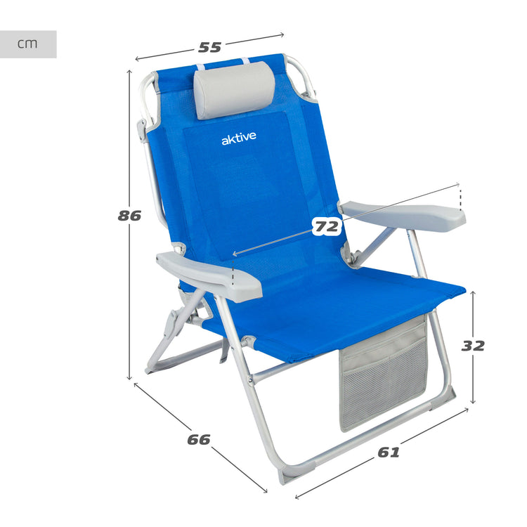 Cadeira de praia XL dobrável e resistente Aktive Beach com encosto reclinável em 5 posições e apoios de braços ajustáveis. Pode ser reclinada horizontalmente graças ao seu suporte de alumínio na parte de trás. A cadeira é azul e os acessórios são cinza. Fabricada com uma estrutura de alumínio de alta resistência que permite suportar um peso máximo de 110 kg e com assento, encosto e acessórios em tecido textileno reforçado. Desdobrado, mede 55 cm de largura, 67,5 cm de comprimento e 86 cm de altura; dobrada com 72 cm de largura e 80,5 cm de altura; altura do assento: 32 cm; distância entre os braços: 72 cm. Inclui uma almofada, 1 bolso de malha na frente, uma bolsa de malha com zíper atrás do encosto, protetores antitombamento nas pernas para maior segurança e uma trava de clique para facilitar a dobra e o armazenamento. Além disso, pode ser transportada confortavelmente como mochila por meio de alças ajustáveis ou segurando com uma das mãos, graças à alça ergonômica incorporada na parte superior da cadeira.