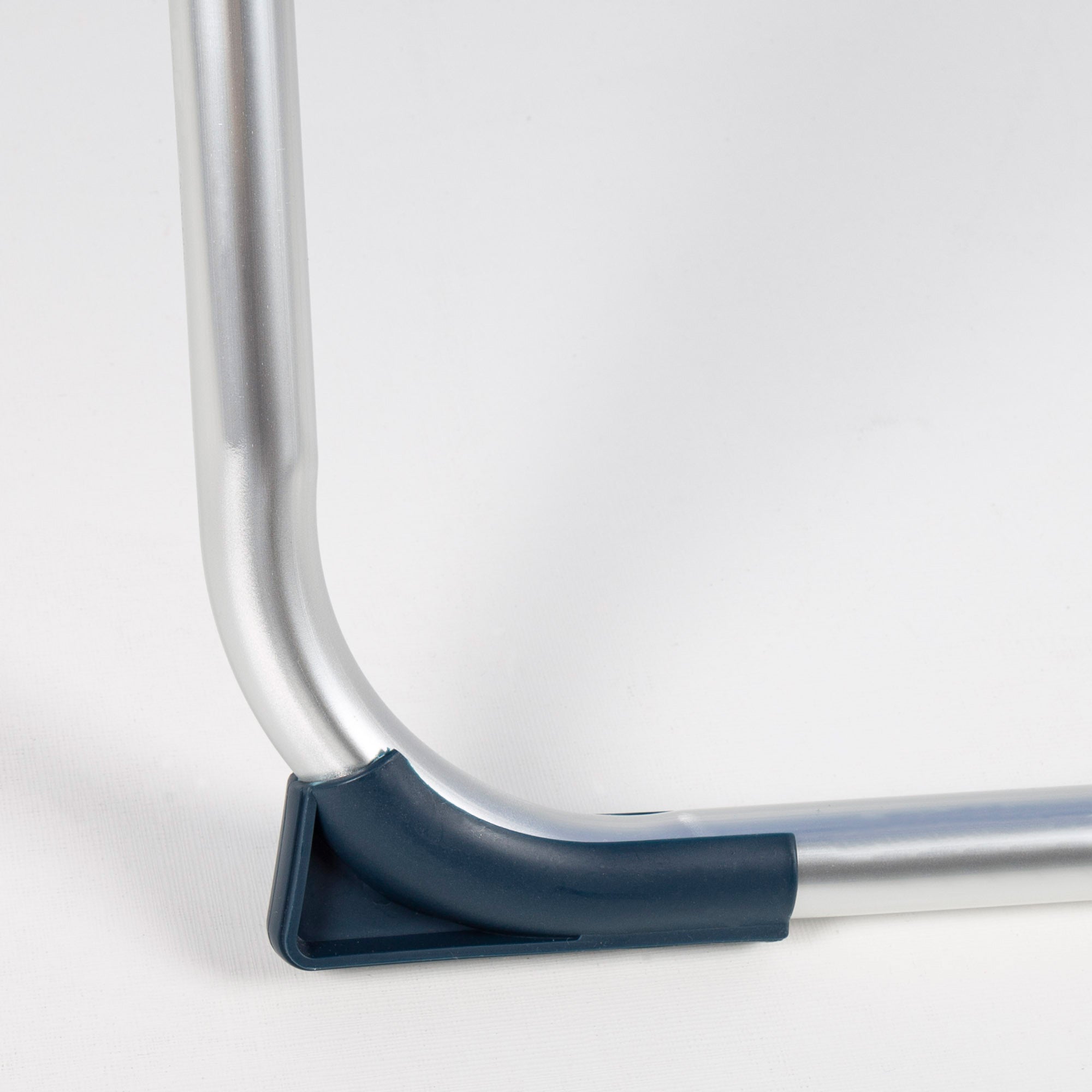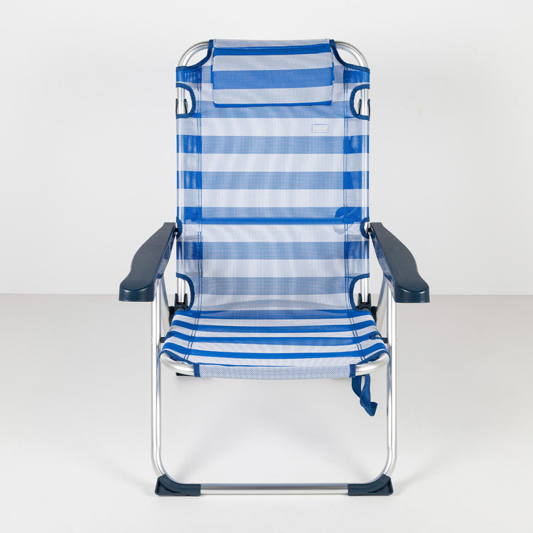 Cadeira de praia Aktive Beach com medidas pensadas para desfrutar de momentos de descontração enquanto se bronzeia na praia. É confeccionada com estrutura em alumínio prateado (suporta até 110 kg), tecido em textileno nas cores listrado azul e branco e apoios de braços ergonômicos em plástico resistente azul marinho. A cadeira oferece grande conforto graças à sua almofada acolchoada e ao encosto multiposições que é fácil de ajustar com os apoios de braços (5 posições). Incorpora um suporte traseiro em alumínio que lhe permite reclinar-se horizontalmente e transformar-se numa espreguiçadeira. Além disso, as pernas incorporam batentes anti-inclinação para maior estabilidade e segurança durante o uso e, graças à sua alça, é muito fácil de transportar, armazenar e empilhar.