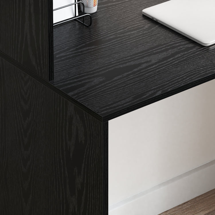 Esta secretária moderna combina estilo e praticidade, sendo perfeita para quem procura um espaço de trabalho profissional ou um canto de estudo em casa. O acabamento em carvalho preto encaixa-se perfeitamente em qualquer escritório ou sala de estudo, acrescentando um toque de elegância enquanto oferece muito espaço para escrever, trabalhar no computador e outras atividades.
