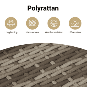 - Material: vime PE, aço revestido a pó, madeira de acácia maciça com acabamento a óleo