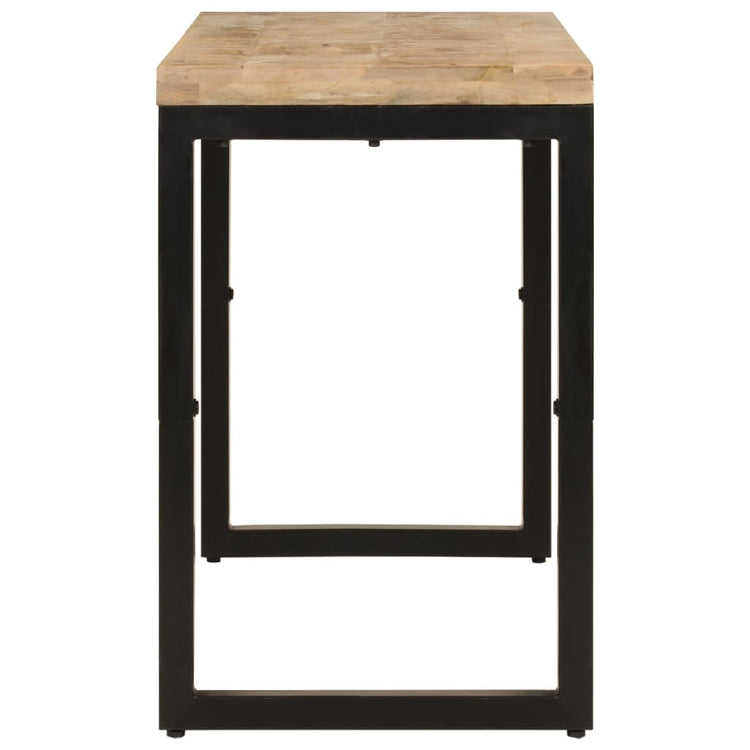 Esta mesa de jantar em madeira será um complemento intemporal para a decoração do seu interior. Madeira de mangueira maciça: esta mesa de cozinha é feita em madeira de mangueira maciça, uma madeira de lei com grãos densos. A madeira de mangueira maciça não só possui força para suportar o peso, como também suporta o desgaste causado pelo tempo.Estrutura estável: a estrutura de aço assegura robustez, estabilidade e também contribui para o estilo industrial da mesa.Tampo prático: o tampo da mesa de balcão oferece uma superfície segura para colocar snacks, bebidas, vasos, fruteiras ou outros artigos decorativos.Design versátil: esta mesa de sala de jantar é vanguardista, mas prática. Pode ser utilizada como mesa de jantar ou mesa de escritório. Nota:As cores podem variar de peça para peça, tornando cada uma única e ligeiramente diferente das restantes. A entrega é aleatória, assegurando a exclusividade e a individualidade do seu produto.Cada produto é fornecido com um manual de montagem na caixa para facilitar a montagem.nan