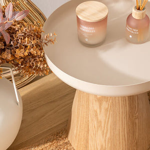 Material: madeira e metal bege. Tampo da mesa: formato redondo. Revestimento do tampo da mesa: revestimento em pó. Folheado de madeira: madeira de freixo. Revestimento de folheado de madeira: tinta acrílica. Acabamento fosco.